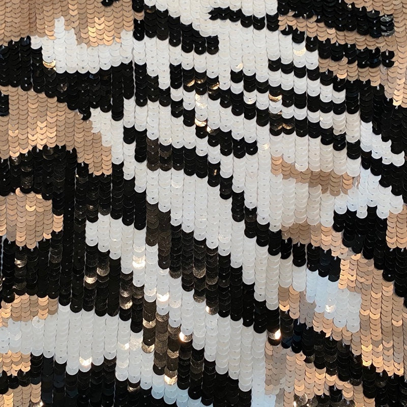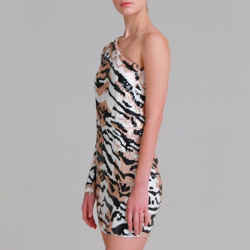 The one shoulder hand beaded "Bengali Tiger” sequins mini dress. Extended puff shoulder with custom shoulder pads with an invisible zipper from bust to hips and at sleeve opening.