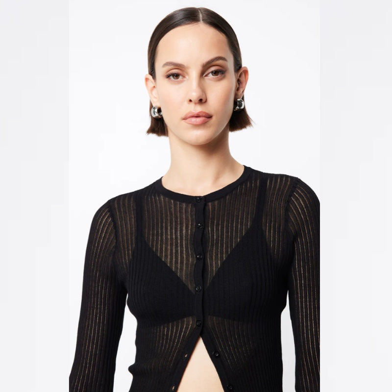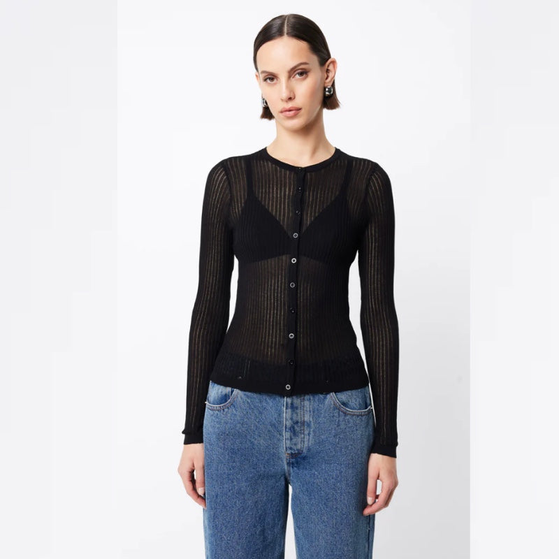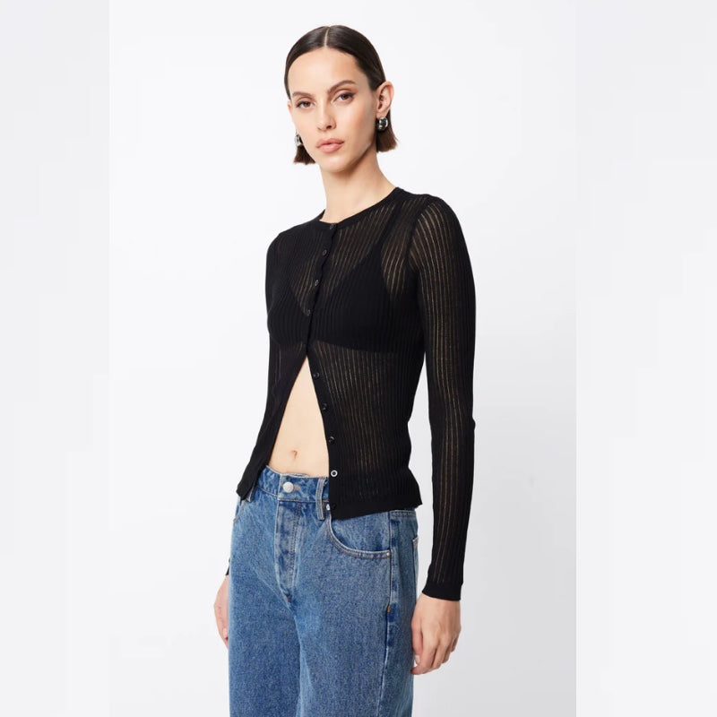 Refined and versatile, the Bristol Cardigan in black is the ultimate layering essential. Crafted from a soft, semi-sheer knit fabrication, it features a classic round neckline, tonal buttons, and long sleeves. Whether worn on its own or layered, this piece transitions effortlessly through the seasons for a sleek, timeless look.