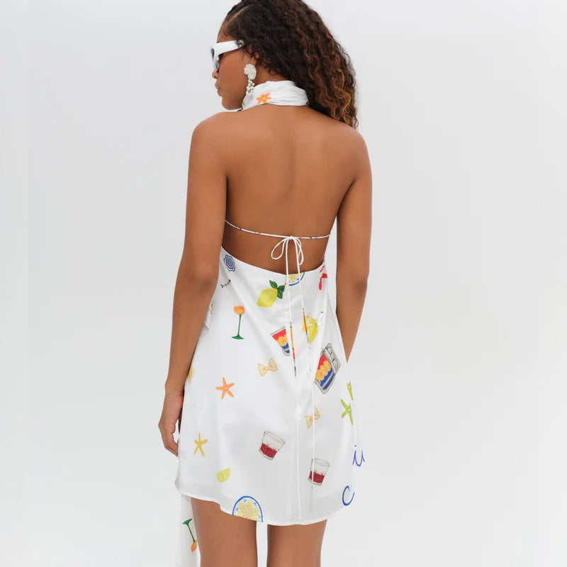 Step into a summer daydream with the multicolor Carla satin mini dress, featuring a Positano print by artist Keely Murphy that captures the essence of summer living. This halter neck mini dress has ruched cups, a flared skirt, and a dramatic scarf necktie that brings the perfect amount of drama.