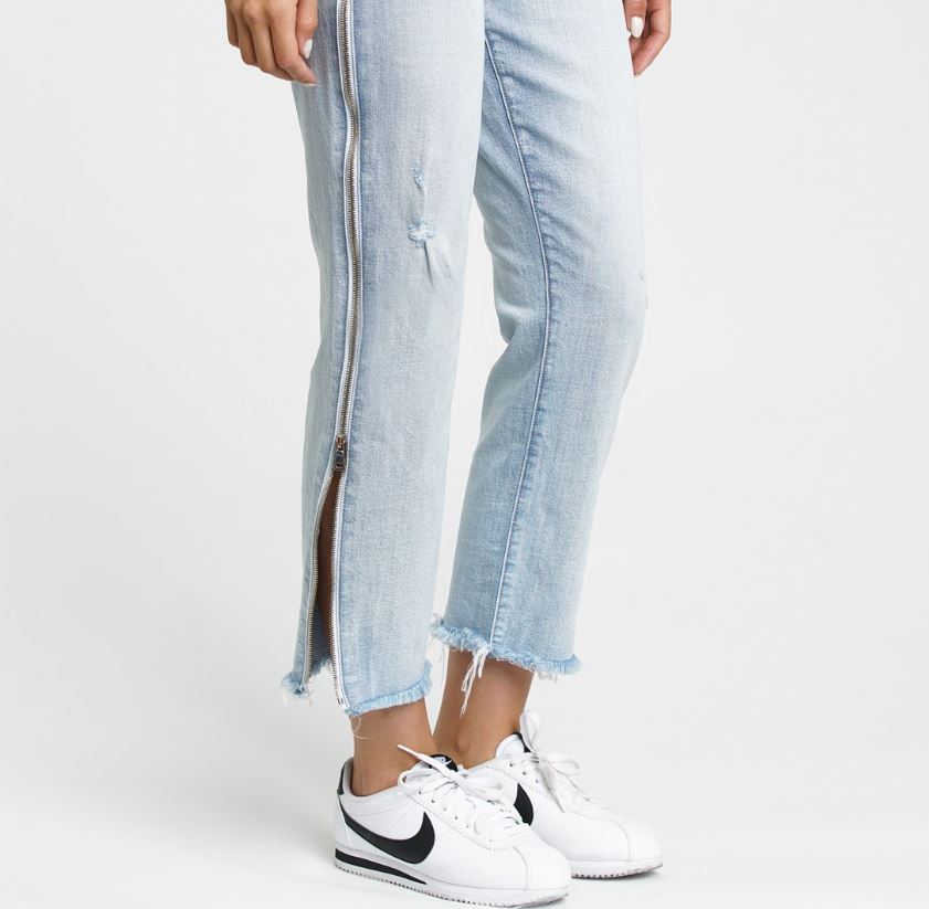Cotton/ Elastane blend. Button fly. Front and back pockets. Exposed side zipper closures. Light fading and whiskering with intentionally distressed areas