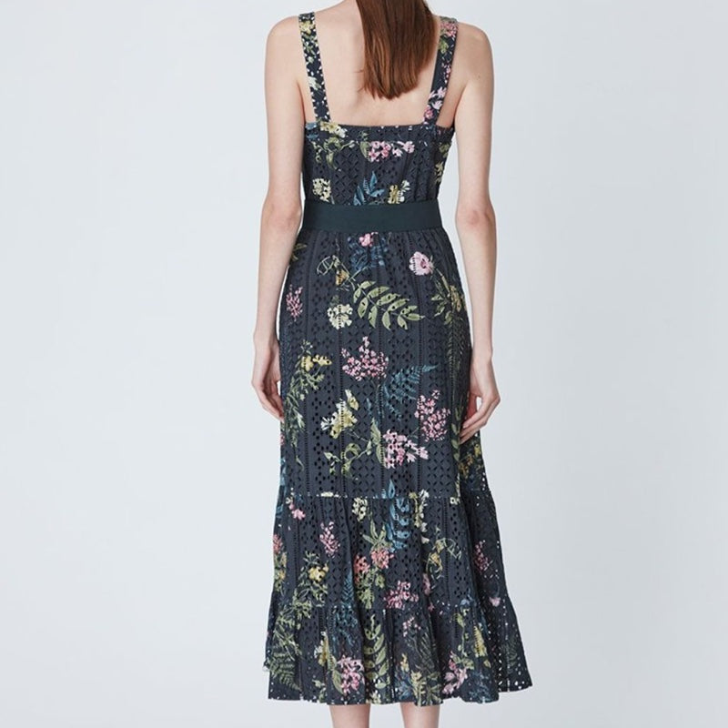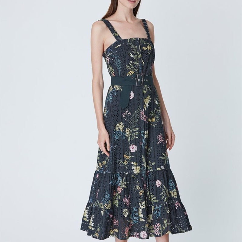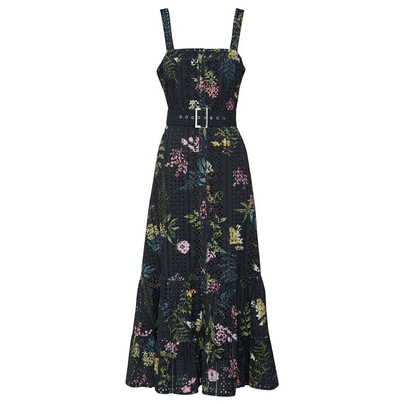 The Hazel Cotton Day Dress is crafted from a digitally printed Cotton Broderie Anglaise and features striking contrast black edging and removable waist belt with silver hardware. This dress features a square neckline with a fitted bodice and adjustable shoulder straps, a centre front button-through closure and is lined through the bodice and down to the flounce of the skirt.
