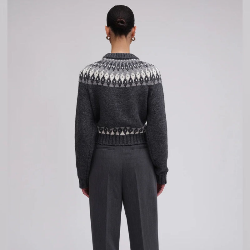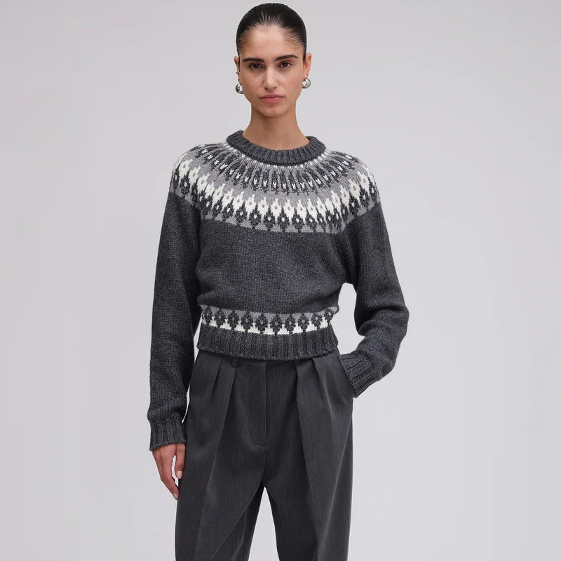 Made from a soft blend of Merino wool and alpaca, this sweater has a Fair Isle motif framing the neckline and hem. Ribbed trims temper the silhouette and lock in warmth.