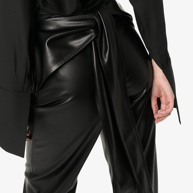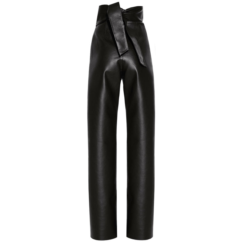 Aleksandre Akhalkatsishvili's pair is cut from faux leather with ties at the waist and stitched creases through the front. Balance the silhouette with a form-fitting tank