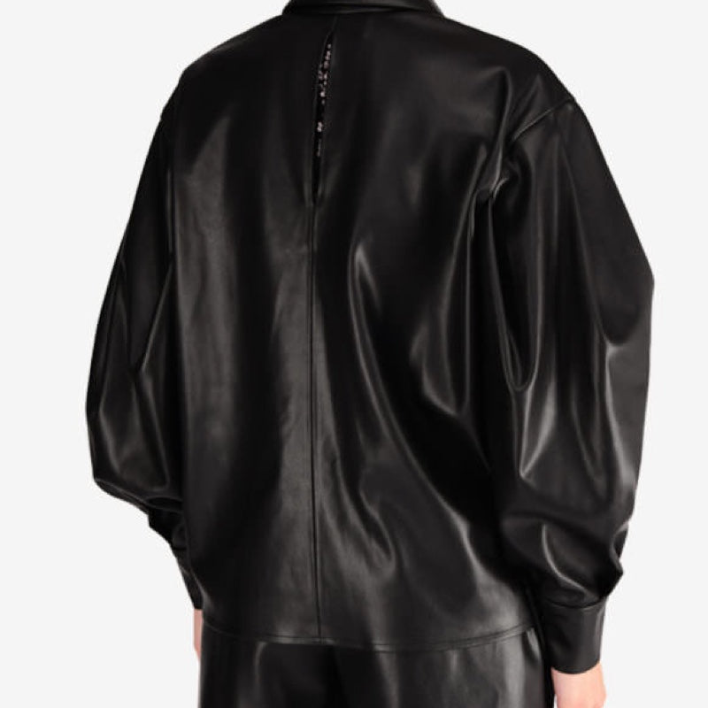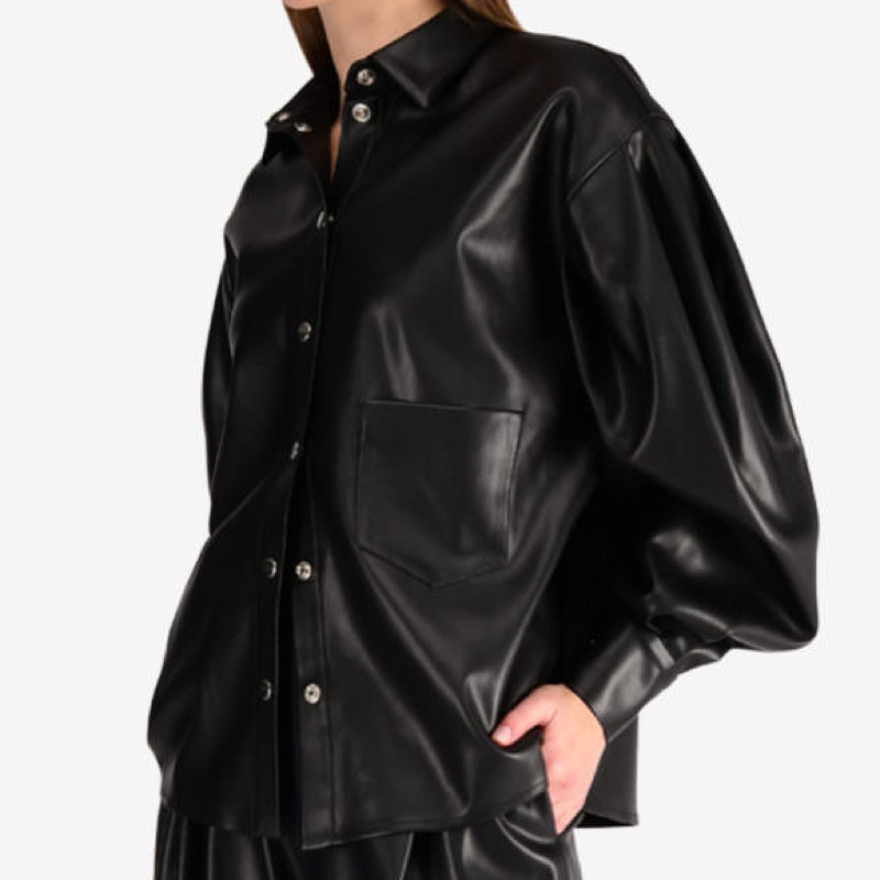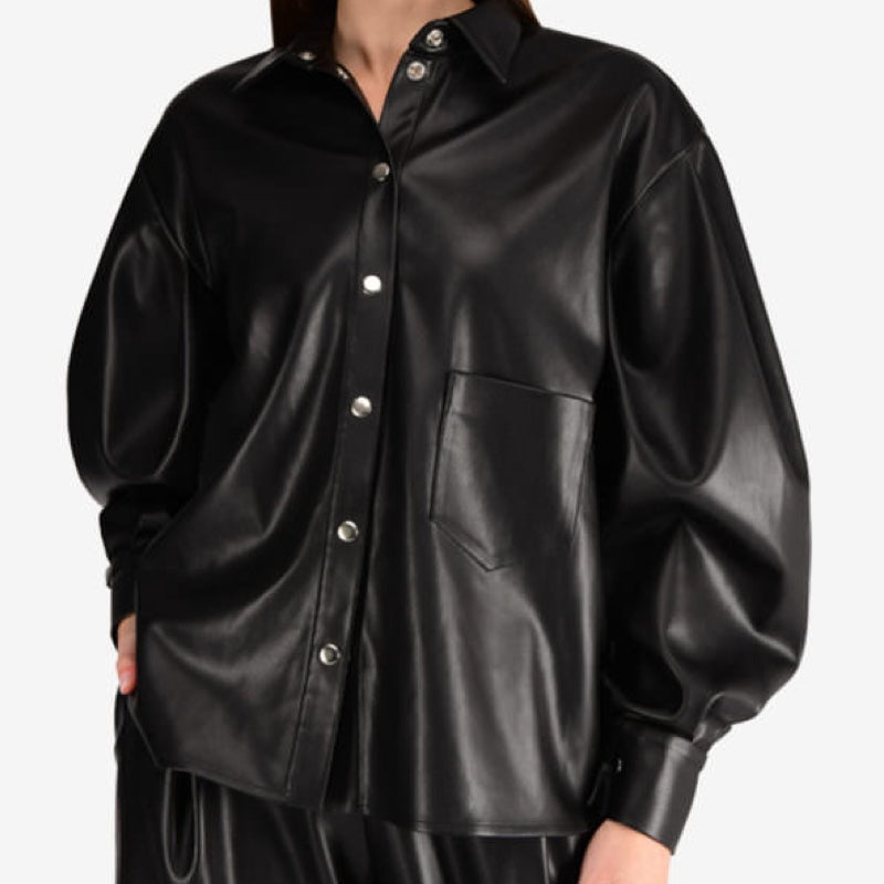 Cut from faux leather, this shirt will be an sophisticated yet edgy addition to your evening edits. The black hue lends a classic touch while the metallic silver buttons lend a welcoming accent.