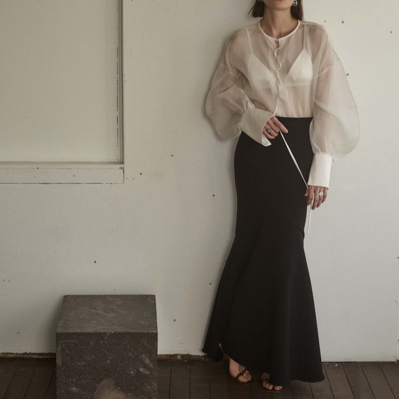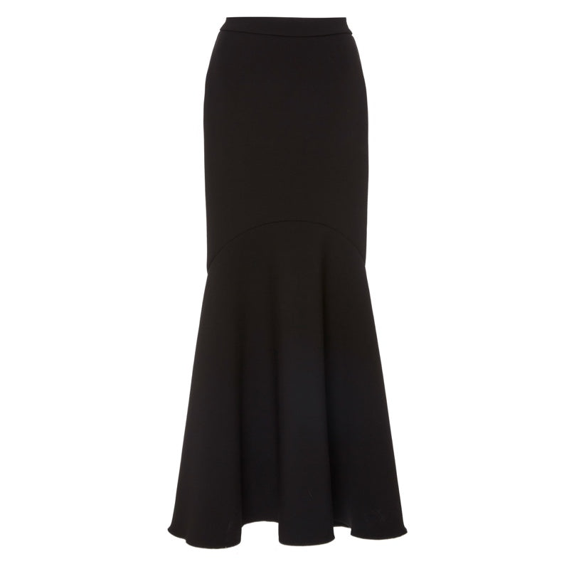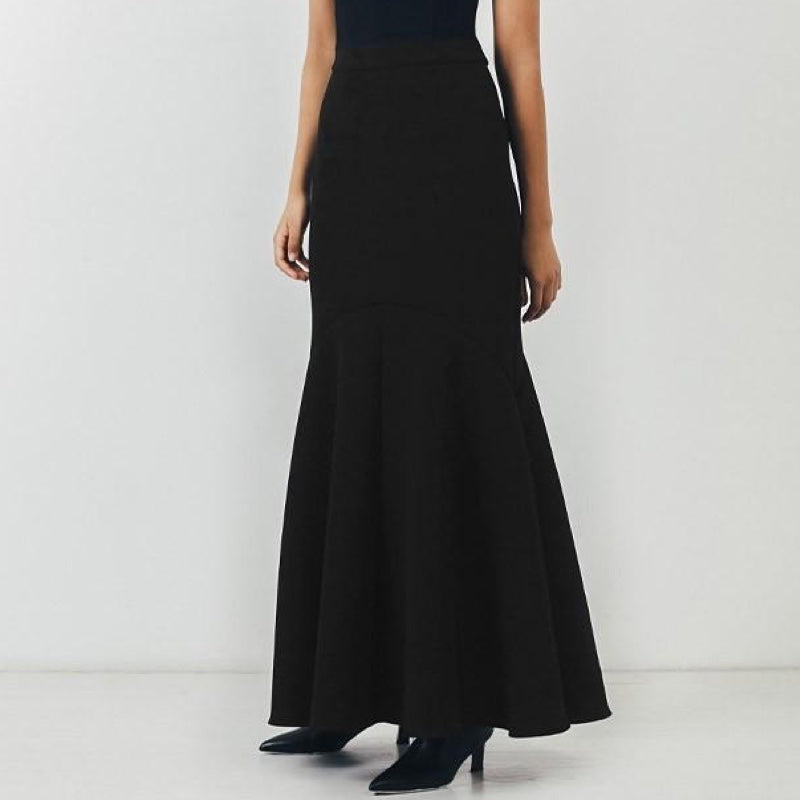 An Elegant high waisted skirt with an exaggerated hem. Made from a sport stretch bonded fabric that flatters and defines curves.