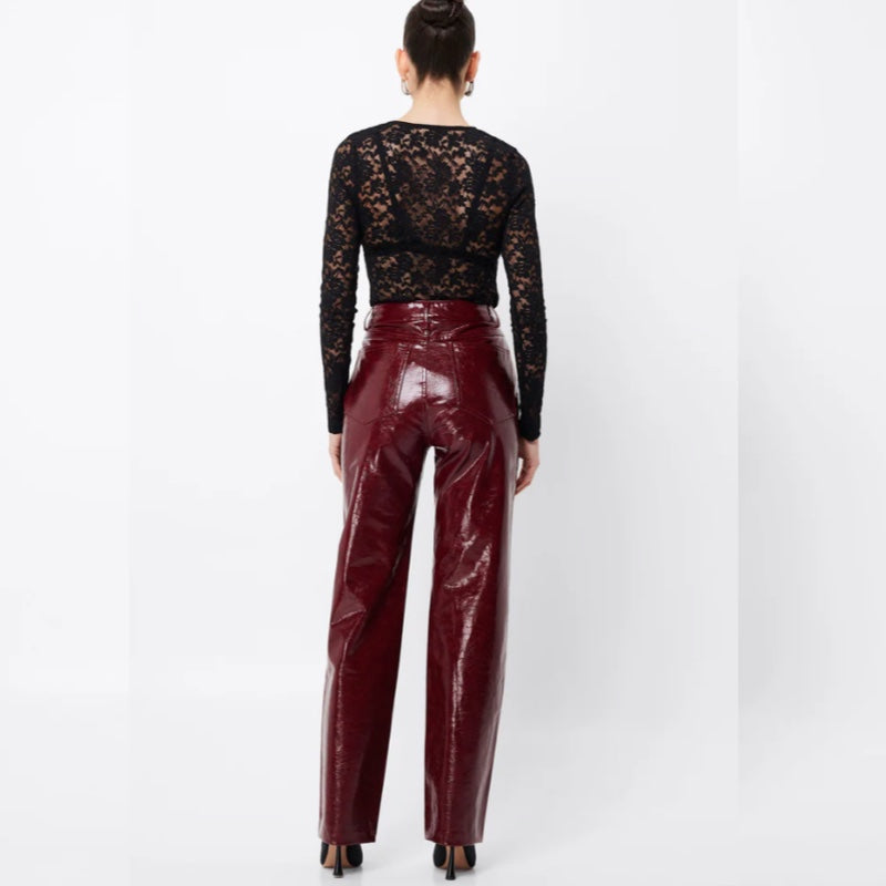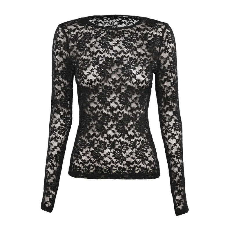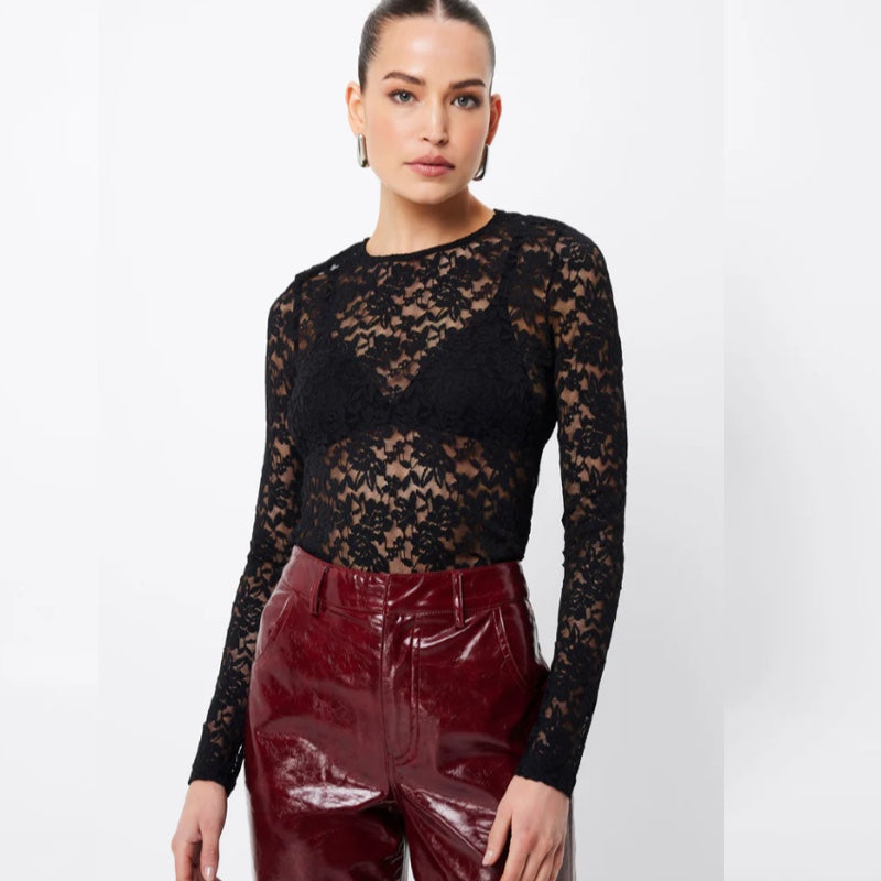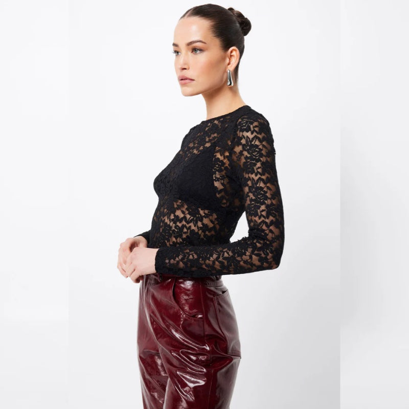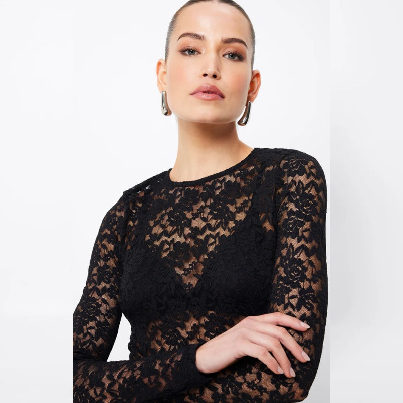 The Fervour Top in black is a striking statement piece crafted from sheer stretch lace. Showcasing a round neckline, long sleeves and a form-fitting silhouette, this top offers a sleek, modern aesthetic with sophisticated appeal. Pair it with our Outspoken Pant for a bold dinner look or style with your favourite jean for a casual date night.