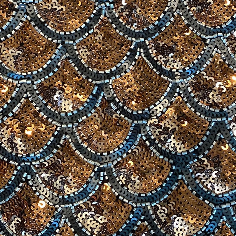 Our one shoulder hand beaded “Mermaid” sequins mini dress. Mix of bronze, and charcoal sequins, with vintage ivory bugle beads. Extended puff shoulder with custom shoulder pads. There is an invisible zipper from bust to hip as well the sleeve opening.