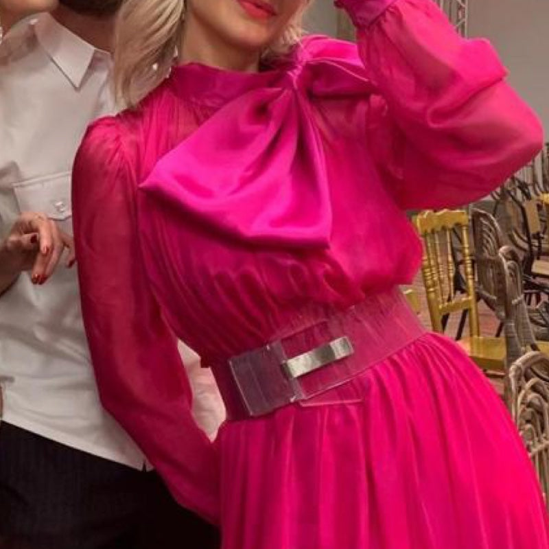 Flare Silk Chiffon Dress With Removable Bow in Fuschia - 36