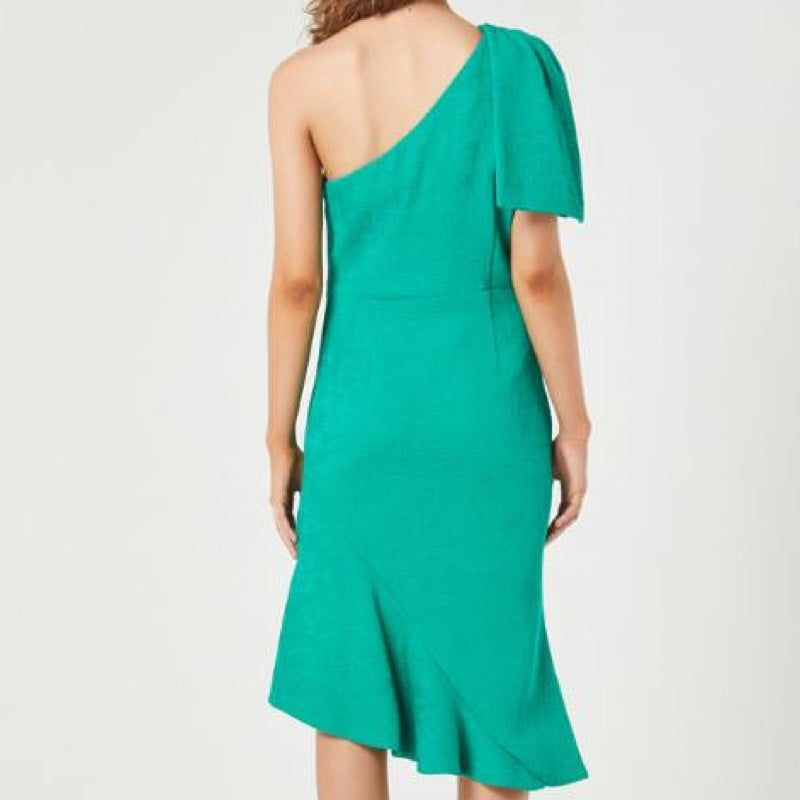 Feminine and alluring, the Fontana Dress by Elliatt boasts a one-shoulder silhouette in a rich emerald hue. The dress features an overlay detail to shoulder and is complimented by an asymmetric frilled hemline.