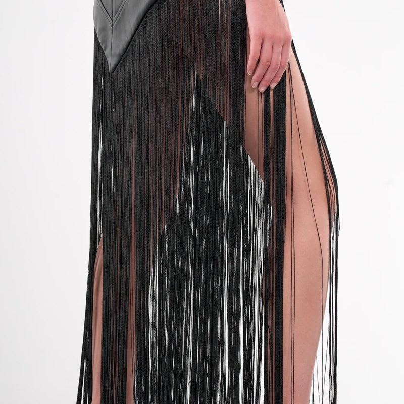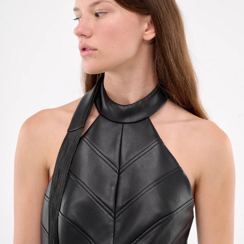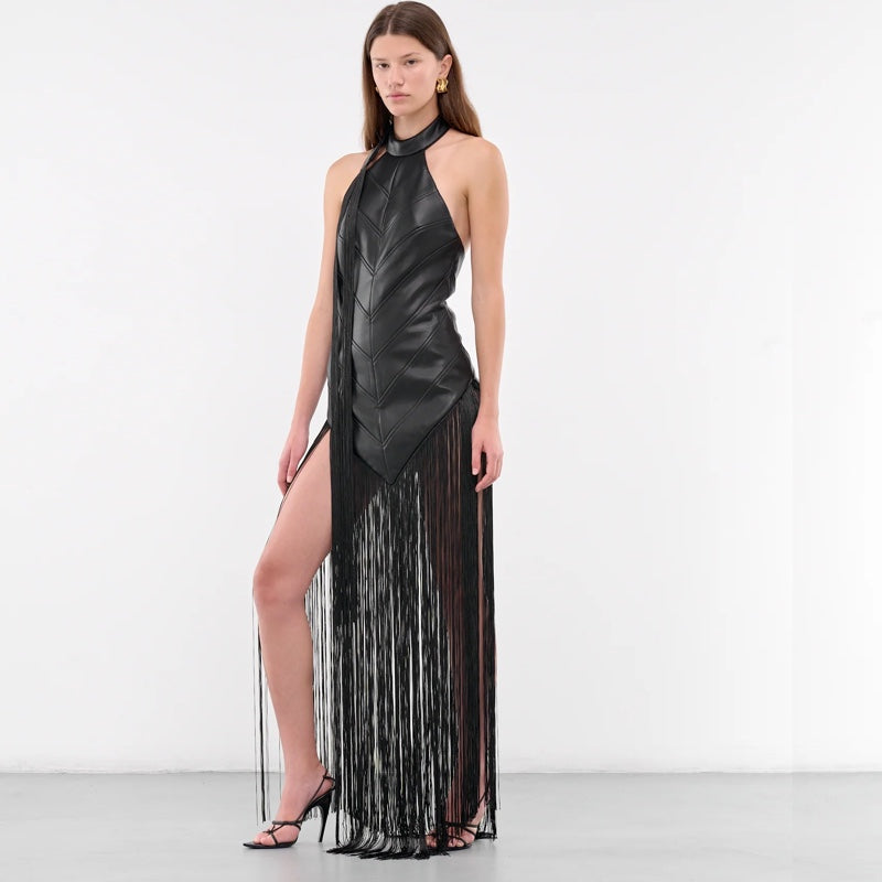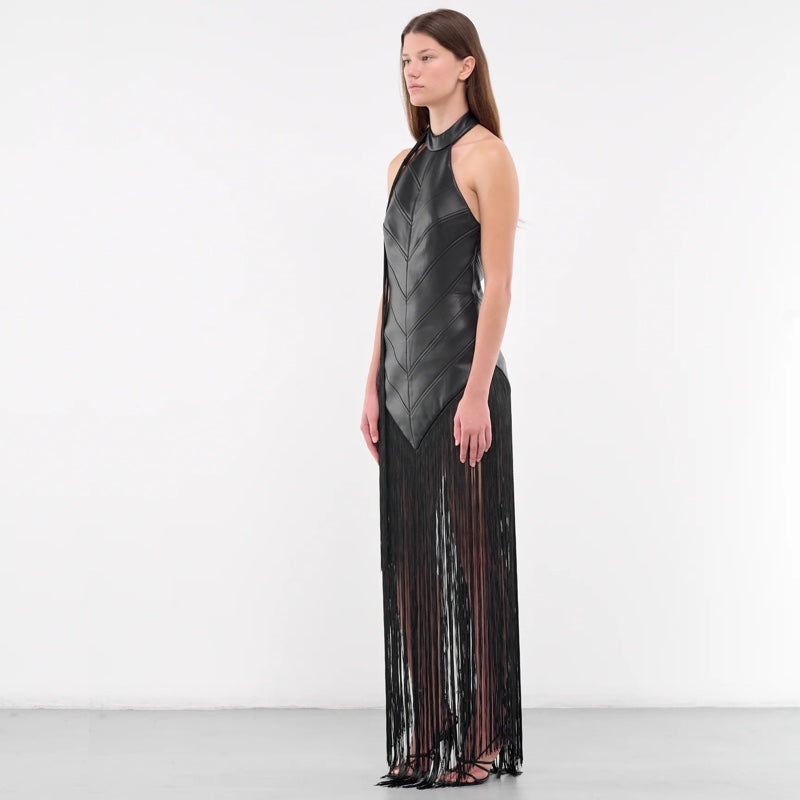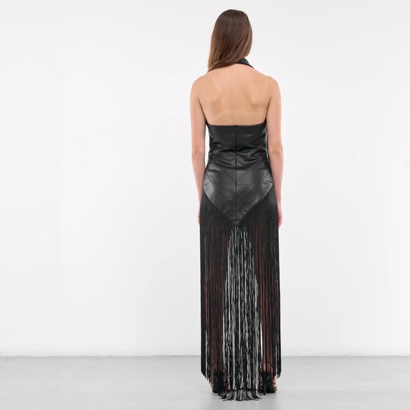 Dress in black, paneled faux leather construction, halter neck, collar fringe trim, sleeveless, armscyes, open back, back concealed zip closure, angled hem, hem fringing, maxi-length, slim fit.