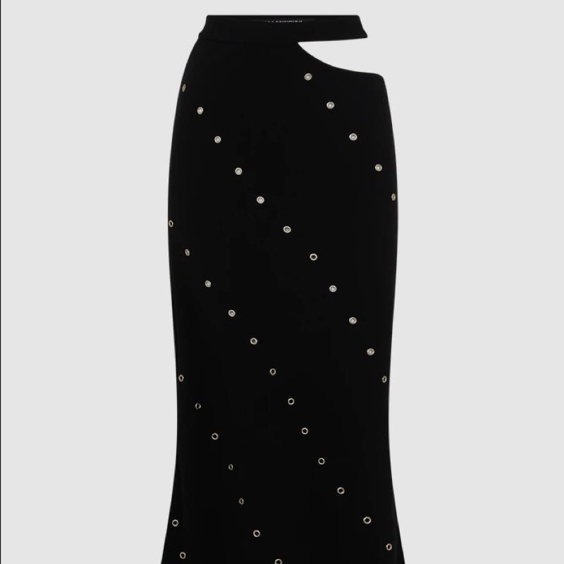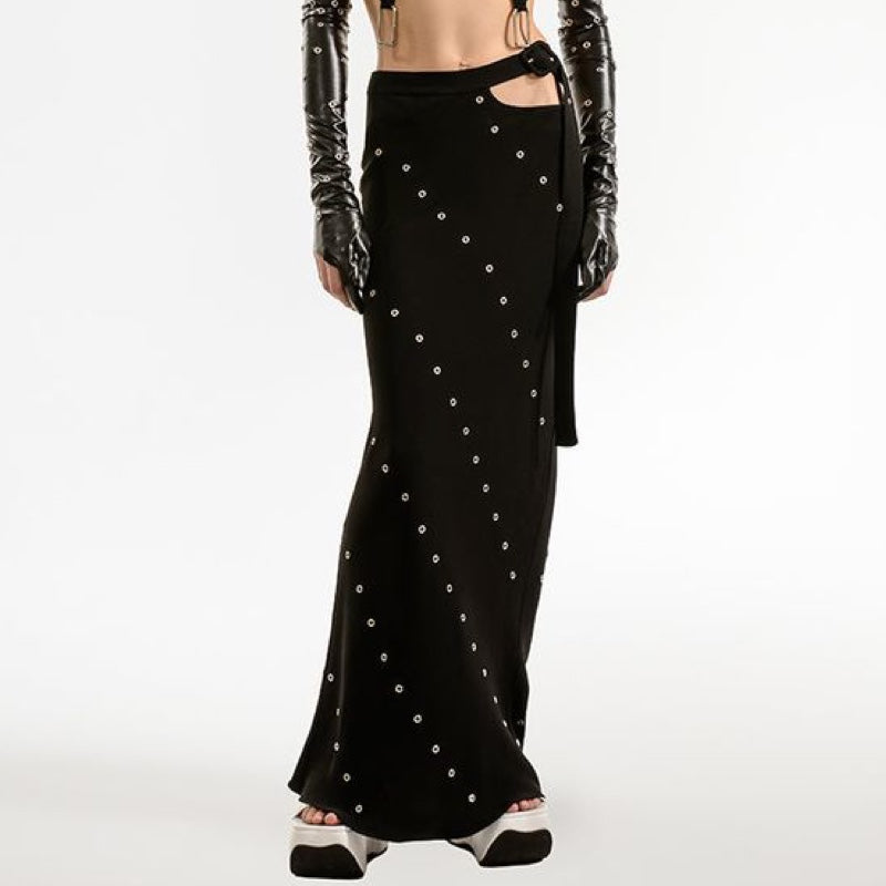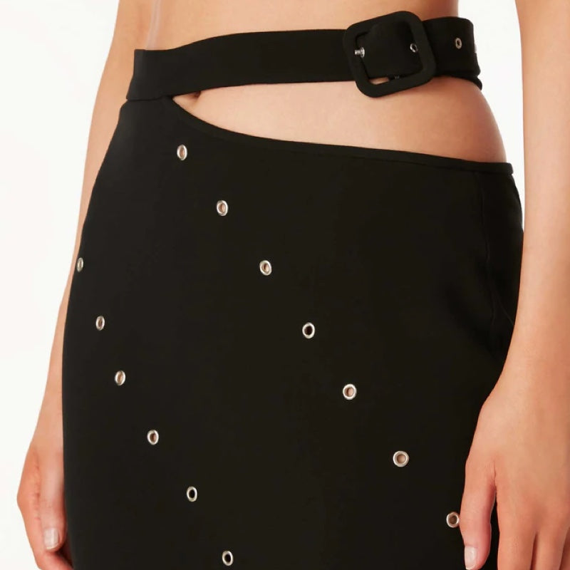 Featuring all over eyelets, slip on this slightly stretchy number, with hip cut out and belt fastening, for an envious evening look.