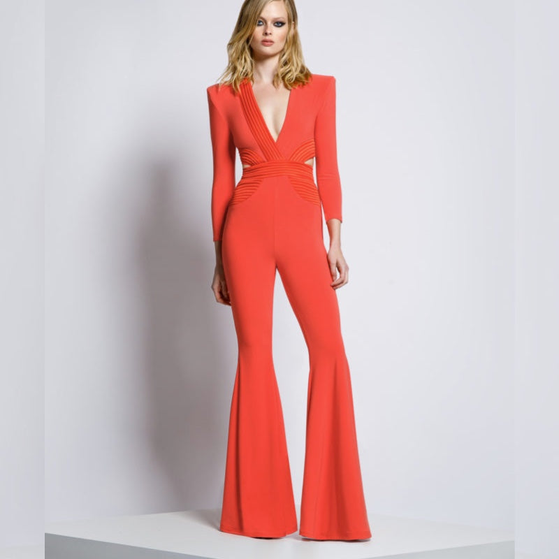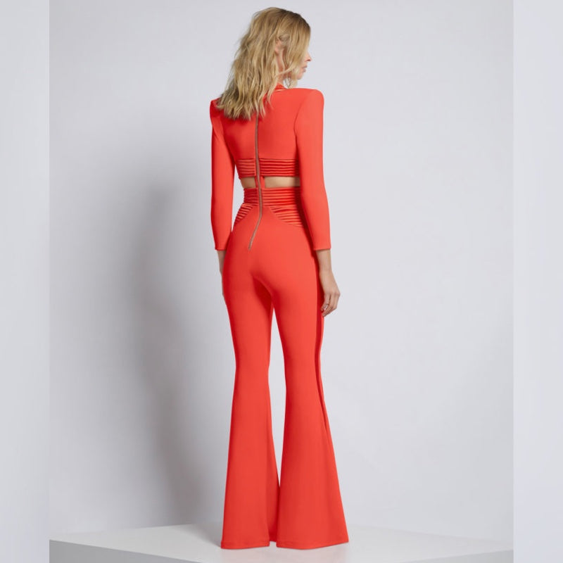A Fully Lined Jersey Jumpsuit With Stitched Satin Panelling, Side Cut Outs And Flared Legs. The Satin Waistband Is A Structured Design.