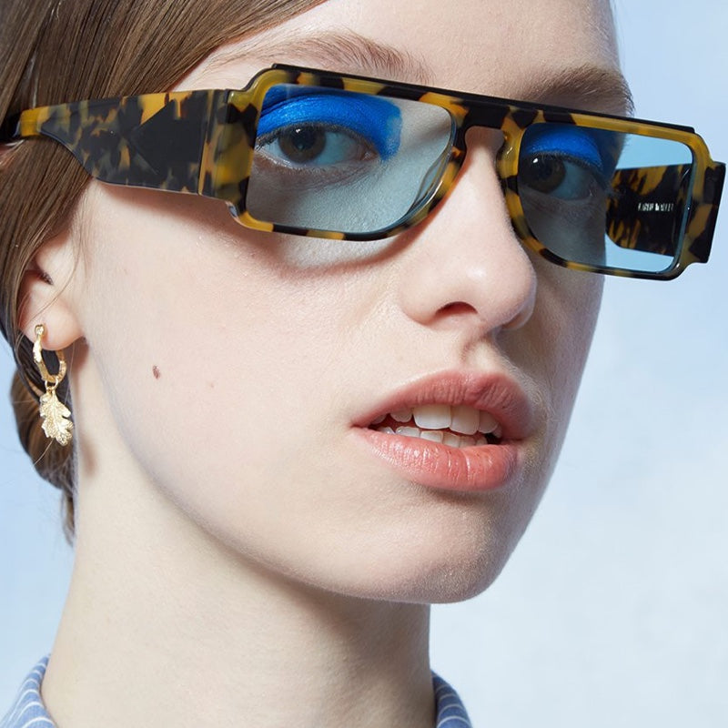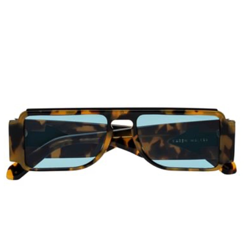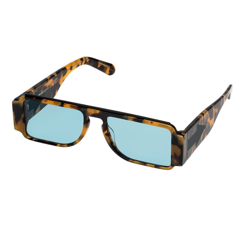 An homage to sci-fi, the Grandmaster glasses with electric teal tint lenses are a peek to the future. Crazy Tort rectangular frames form a strong brow line complete with a gold metal detail and squared-off temples while the directional Karen Walker arrow adorns chunky arms. Designed as a beauty tool, teal tint lenses offer limited UV protection, for extended wear in bright sunlight a darker lens is recommended.
