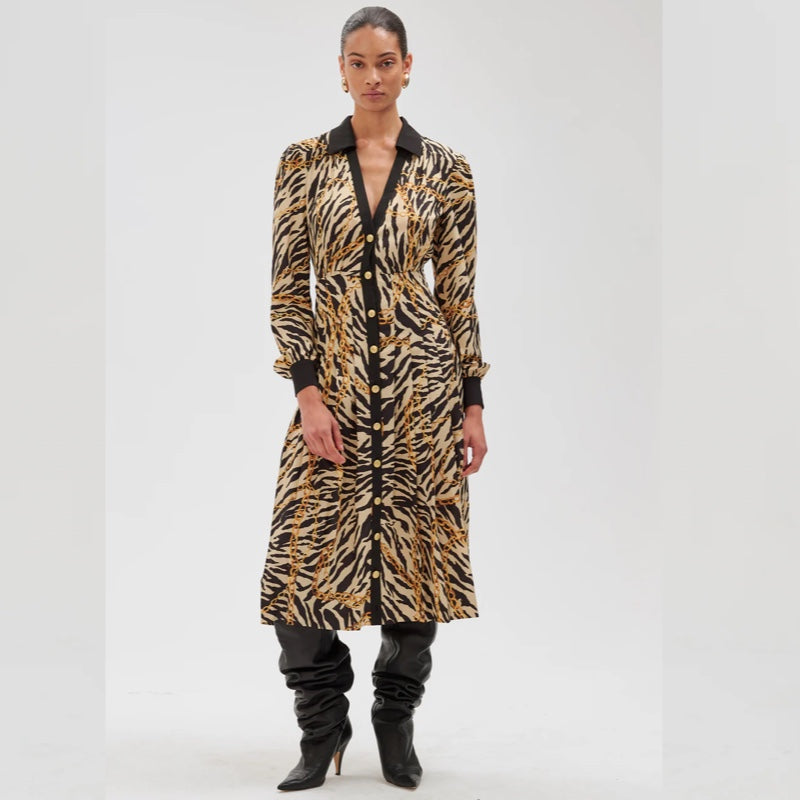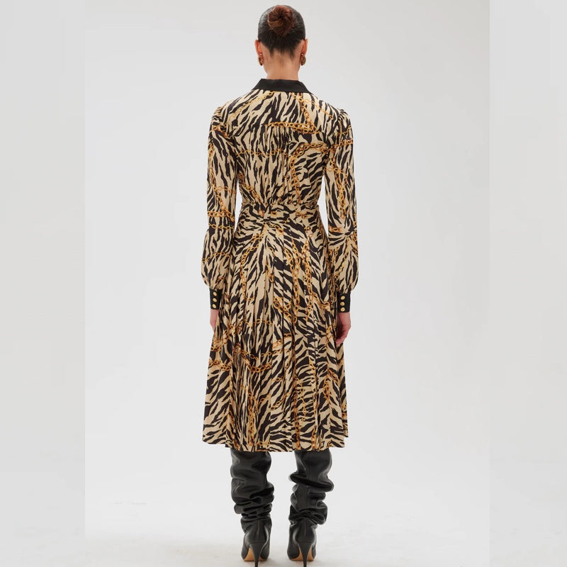 A bold mixed zebra-cheetah pattern gives this dress a modern edge. The fitted silhouette accentuates the frame, while the flowing hemline introduces a sense of ease and motion.