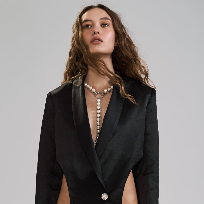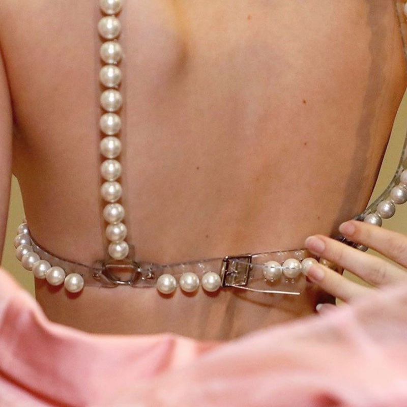 Pearl body harness features hand-stitched pearls on clear PVC straps. The back strap includes a buckle for adjustable sizing.