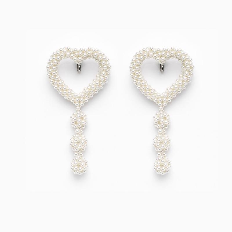 Laurence & Chico presents these bold clip earrings crafted from pearls in a heart silhouette that suspends three clusters of pearls