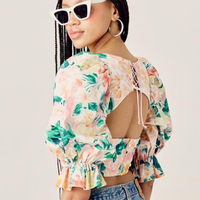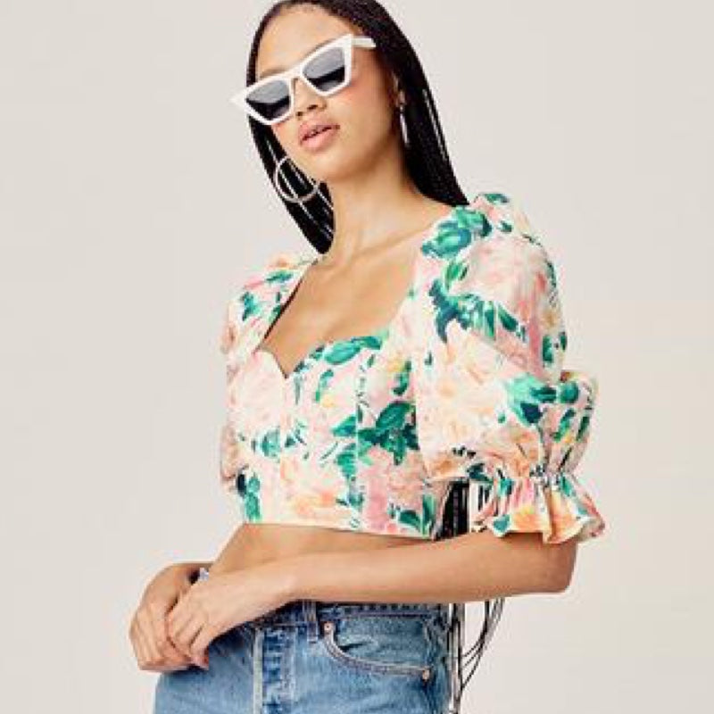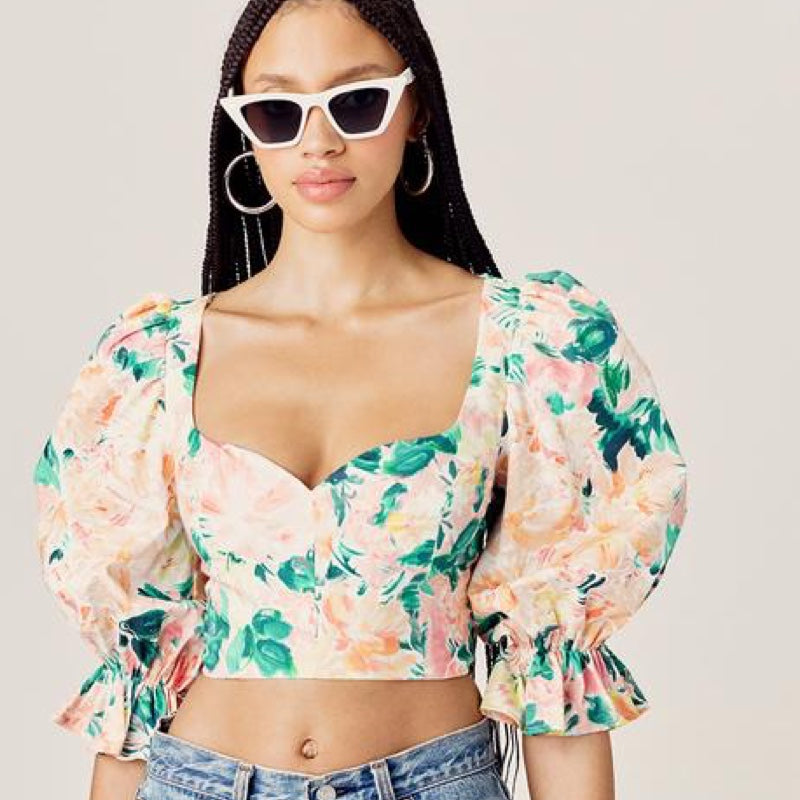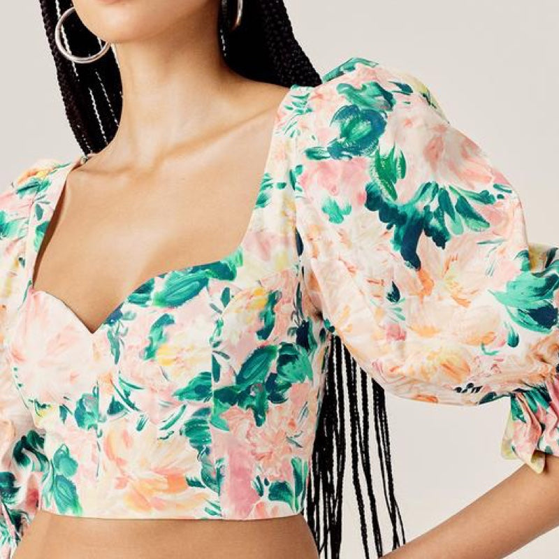 Work of art. Watercolor floral print crop top featuring a romantic sweetheart neckline and puff sleeves. Pretty peekaboo keyhole back, lace-up detailing. Made from stretch cotton poplin.