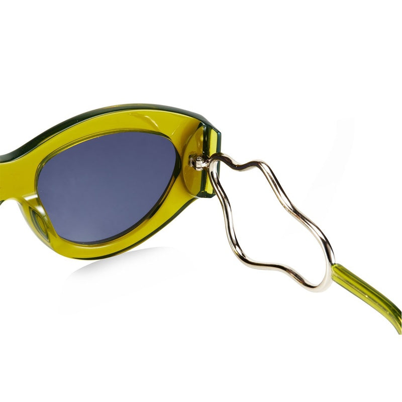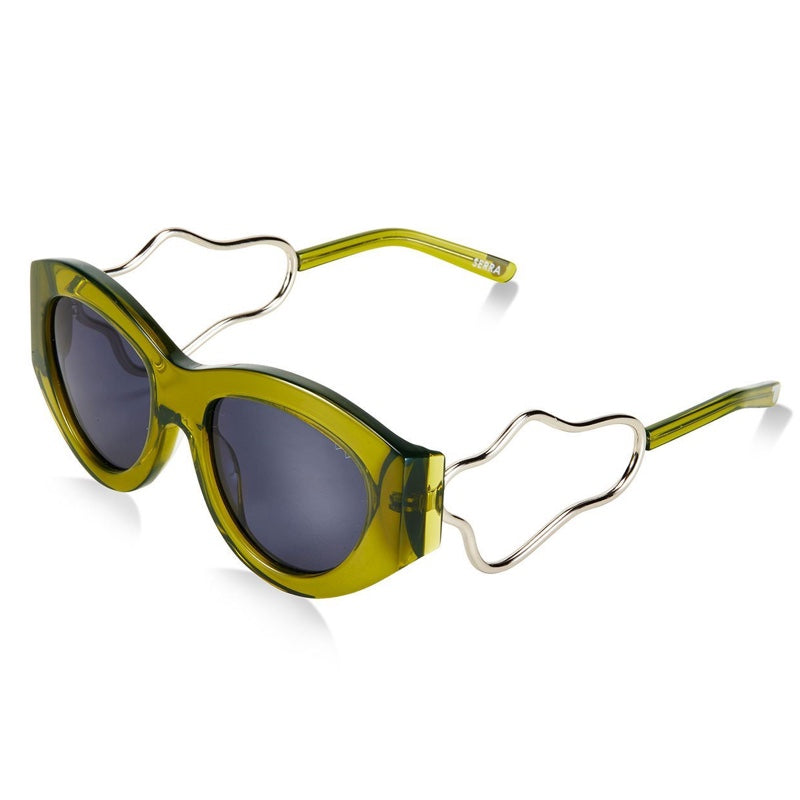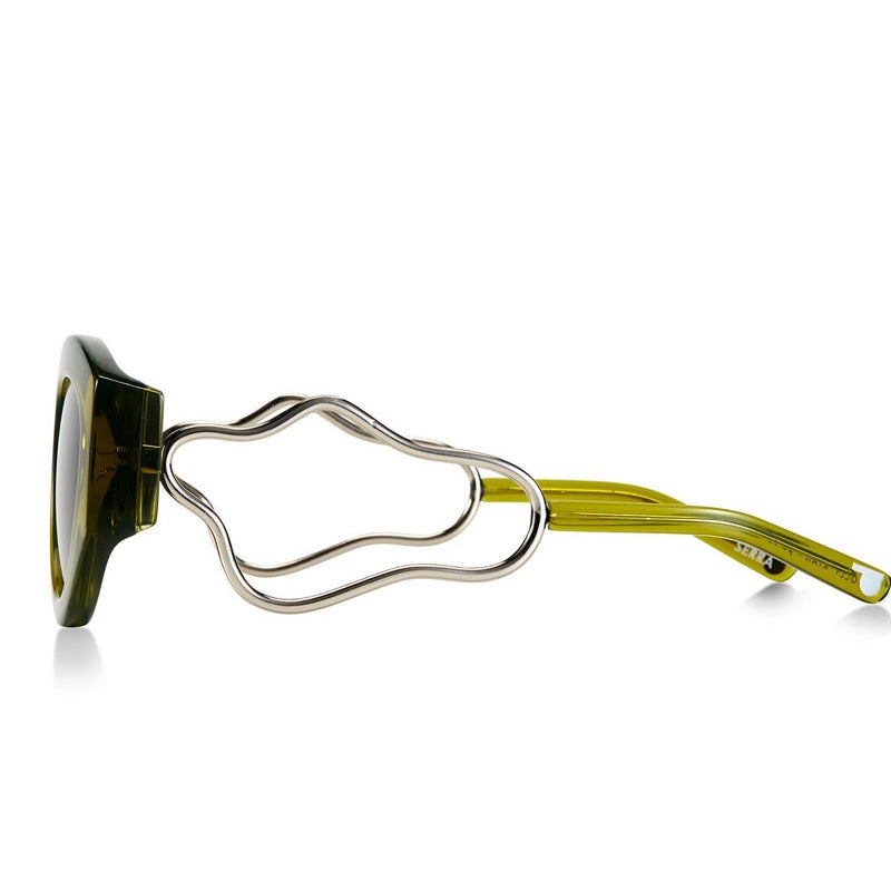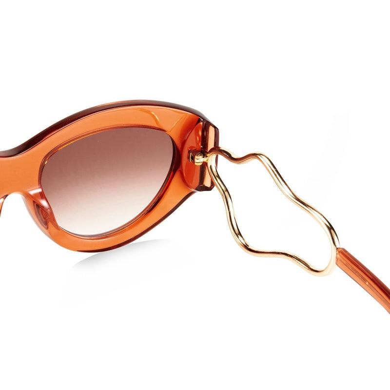Handmade acetate front and silver squiggle temple. Brown gradient CR39 lenses. UV 400 / 100% UVA & UVB protection. Gold "p" inlay, hinge and engraving. German rubber dipped screws.