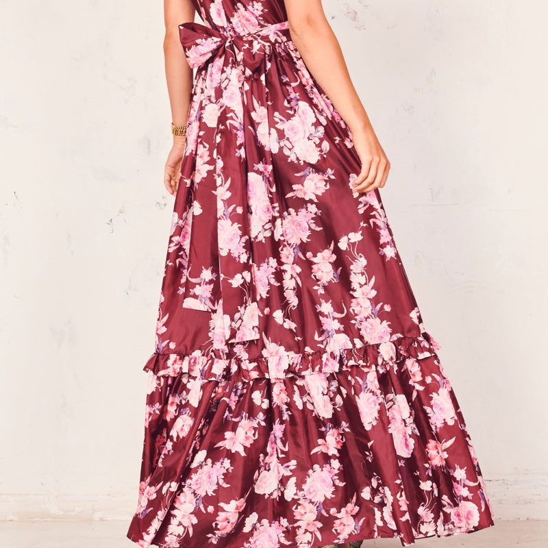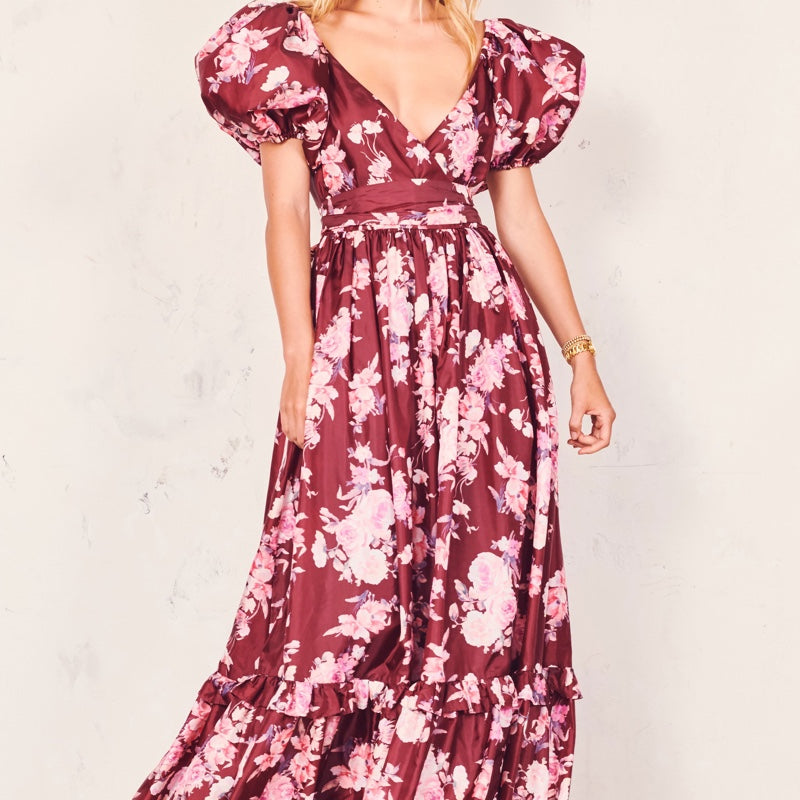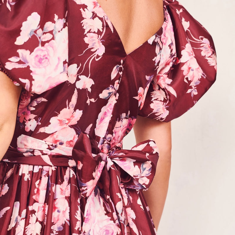Ida Dress debuts in dramatic taffeta with an oversized chintz rose print. This faux wrap frock has a deep V neckline that extends to a separate sash, tied at front or back waist. Dramatic puffed sleeves—with encased elastic at both ends—have inner mesh lining to hold their shape. The full sweep skirt is shirred and falls to a ruffle detail and flounce at bottom.