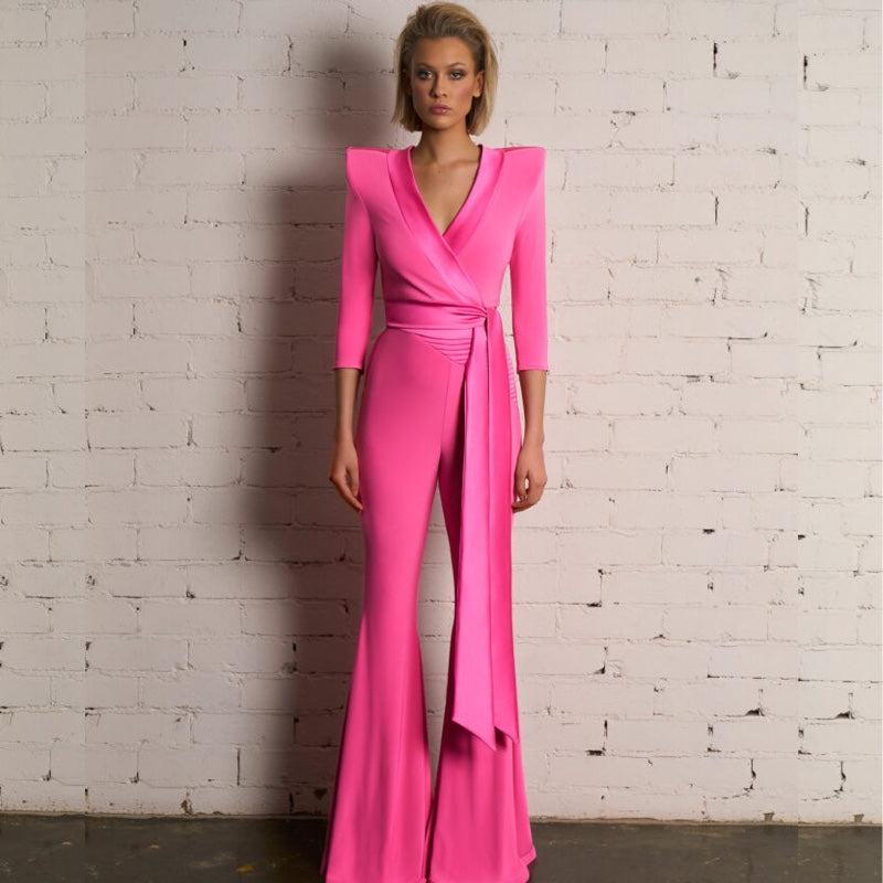 A JERSEY WRAP STYLE EASY FIT JUMPSUIT WITH SATIN HIP FEATURE, FLARED LEGS, LONG SATIN TIES, AND SHOULDER ACCENTS