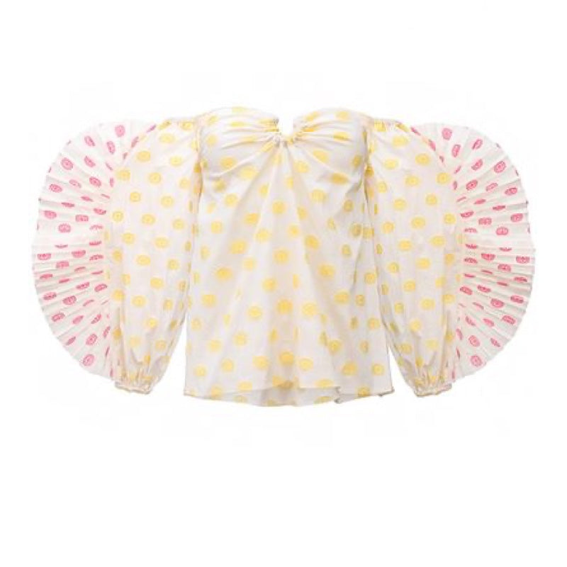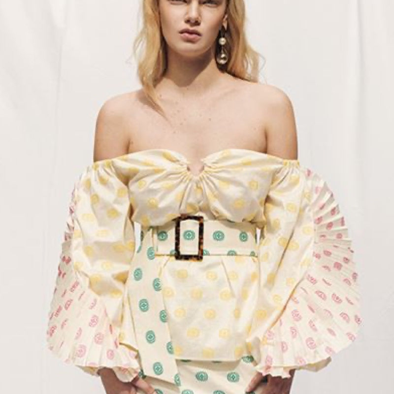 Jacquard Top with buff sleeves & pleated Decor with belt