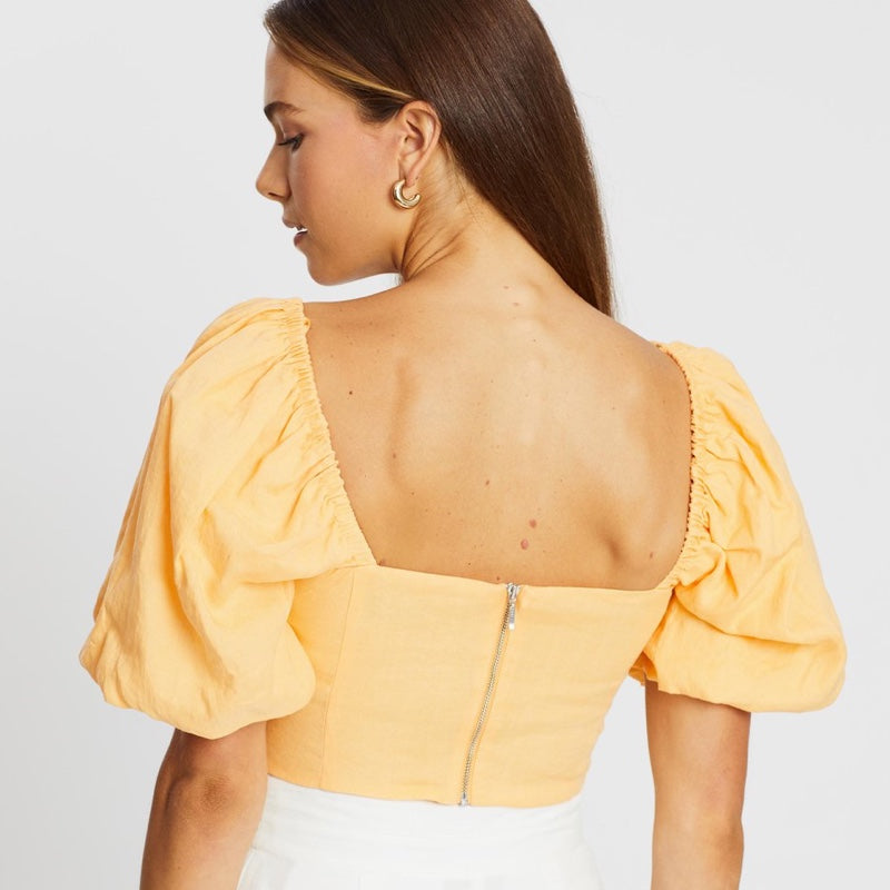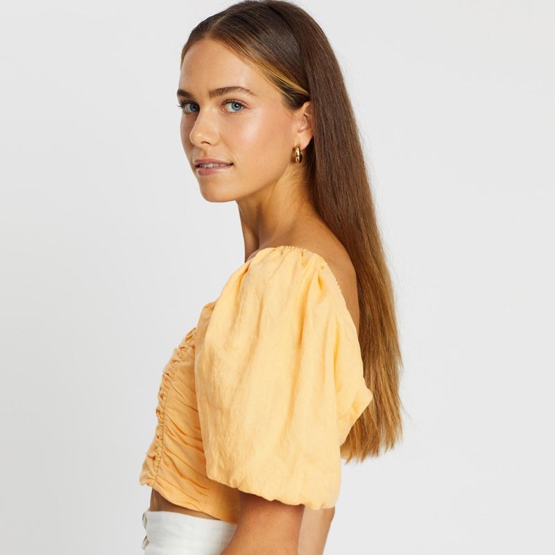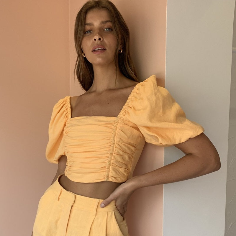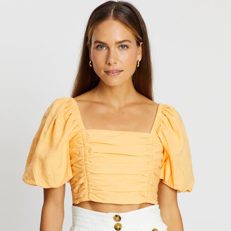 Gathered crop features bubble sleeves, a 90s inspired square neckline and gathered bodice panels.