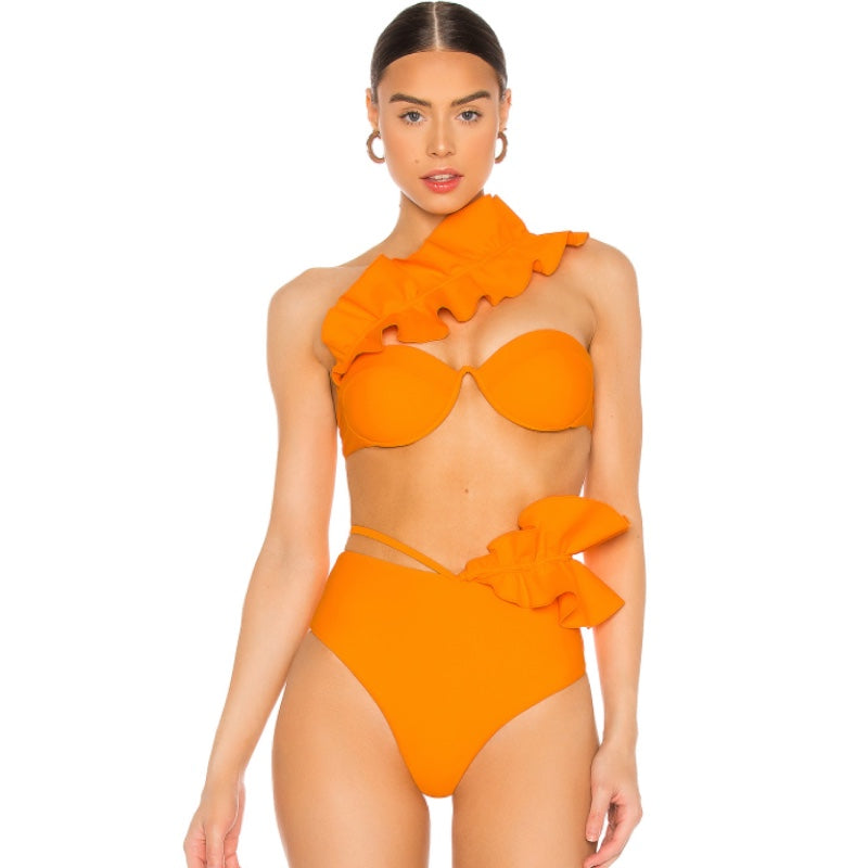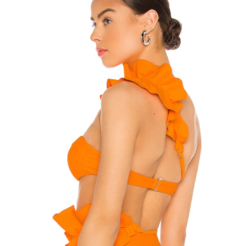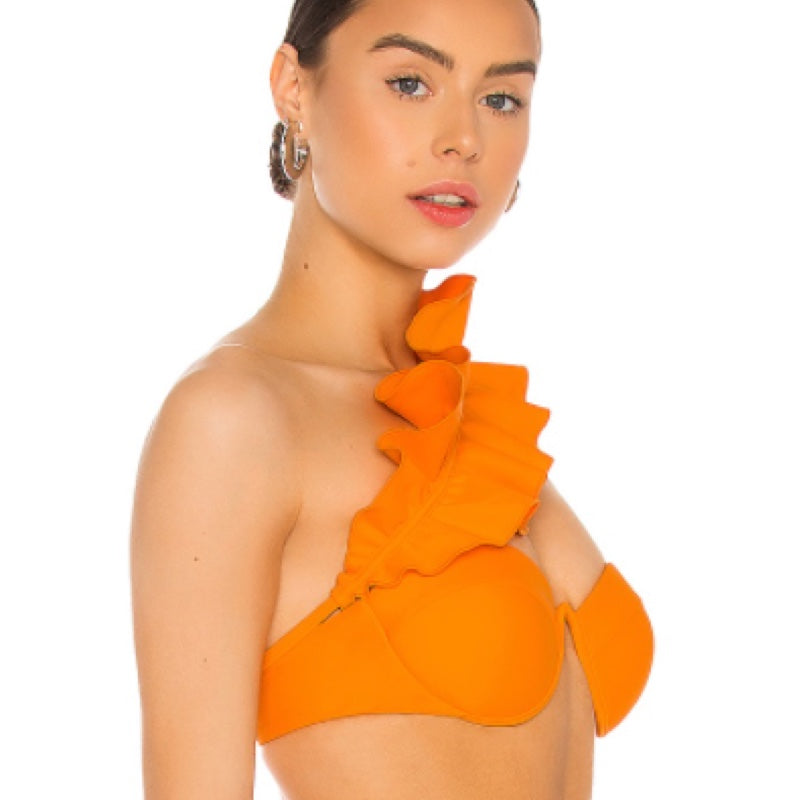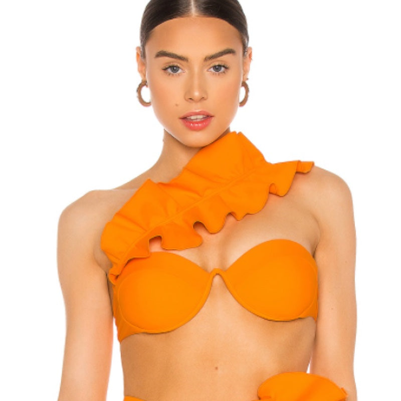 Padded underwire cups. Back S-hook closure. Adjustable shoulder strap with reinforced ruffled trim