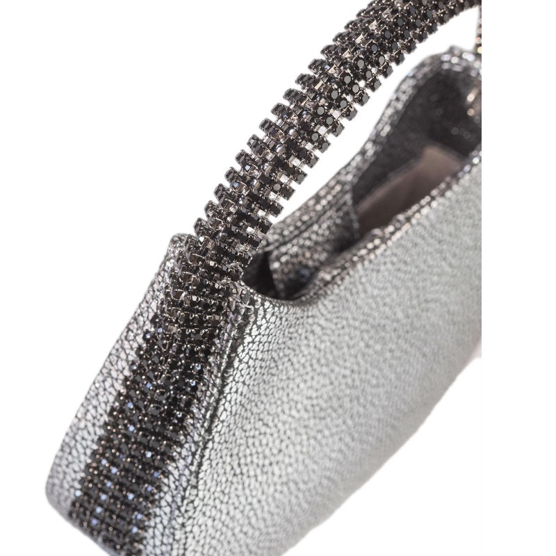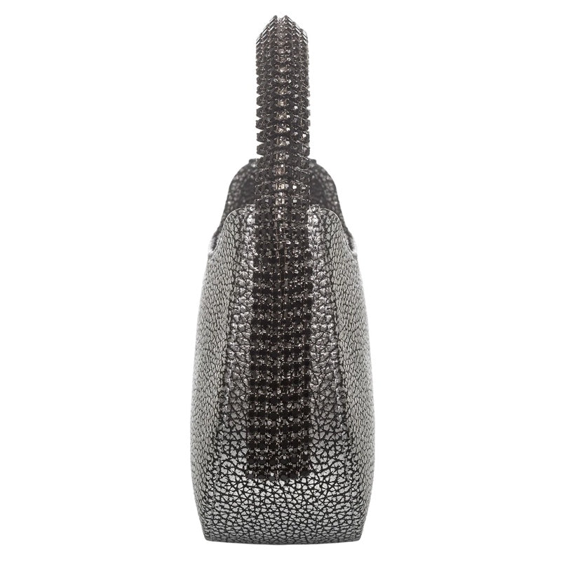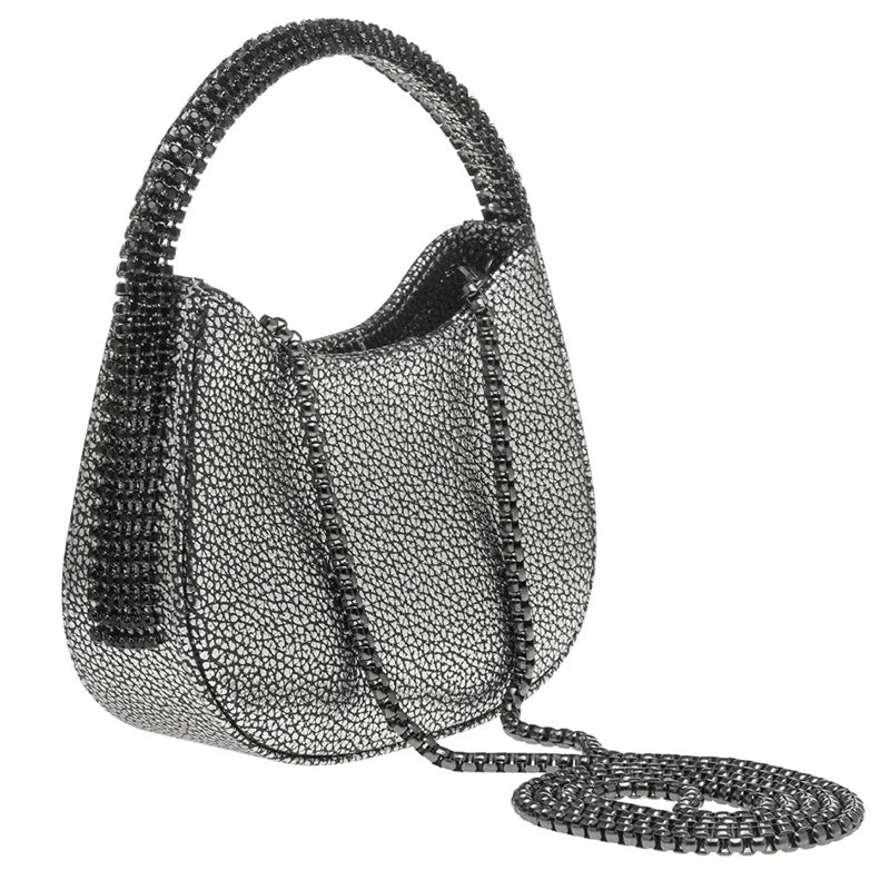 The Koda bag, crafted from dark silver leather and used with a luxurious gunmetal chain. Its handle is adorned with jet black crystals for a glamorous look. The combination of colors are blend together for timelessly elegant appeal.