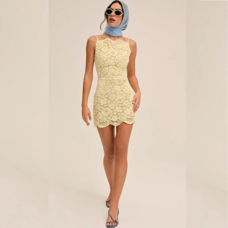 Dress for the Riviera with the Lakeside lace mini dress–a little white dress crafted in a classic floral lace and adorned with scallop hems. This high neck dress features a low open V-shaped back for an effortlessly feminine chic look.