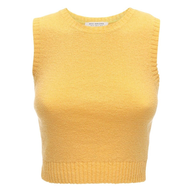 Sleeveless knit tank with ribbed detail. Knitted stretch fabric. Cropped fit.