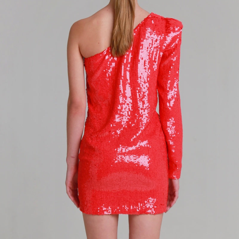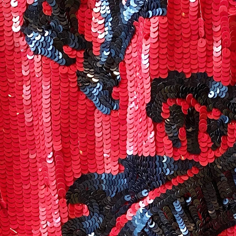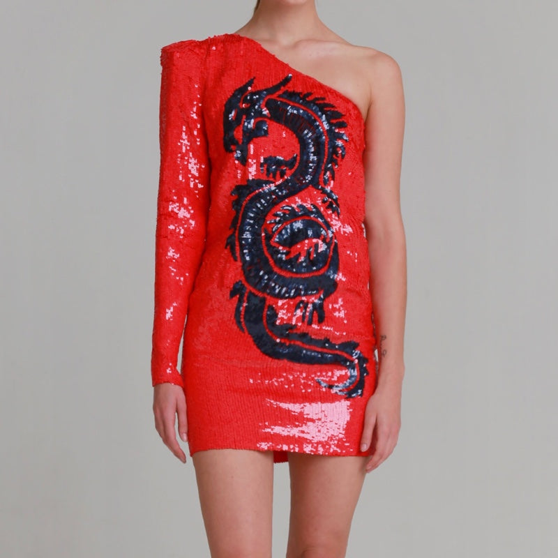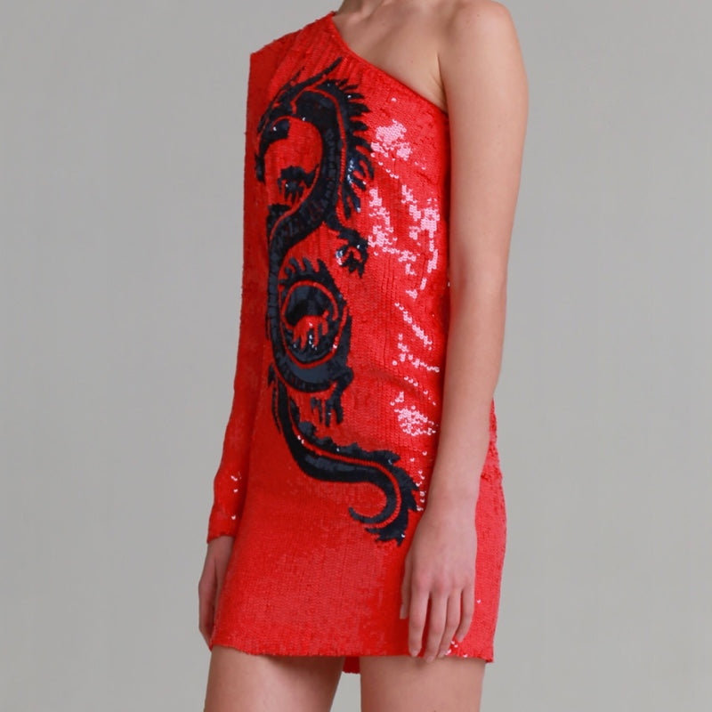 Our one shoulder “Blue Dragon" beaded sequins mini dress with navy dragon embroidery. Extended puff shoulder with custom shoulder pads. There is an invisible zipper at center back as well as the sleeve opening.