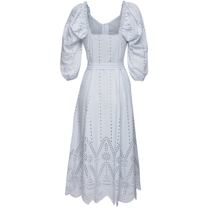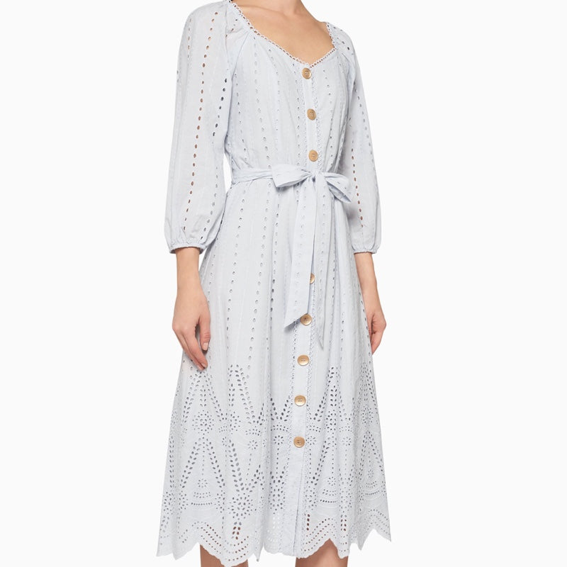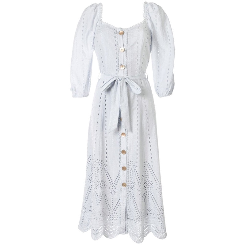The Lola Off Shoulder Dress is a great day-to-night staple. This Broderie cotton dress features ¾ length blouson sleeves and a button-down centre front with removable self belt. This style features a placement cut Broderie design and scalloped hemline which is complimented by a delicate scalloped trim. This style is completely lined.