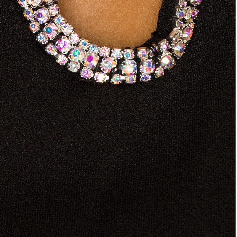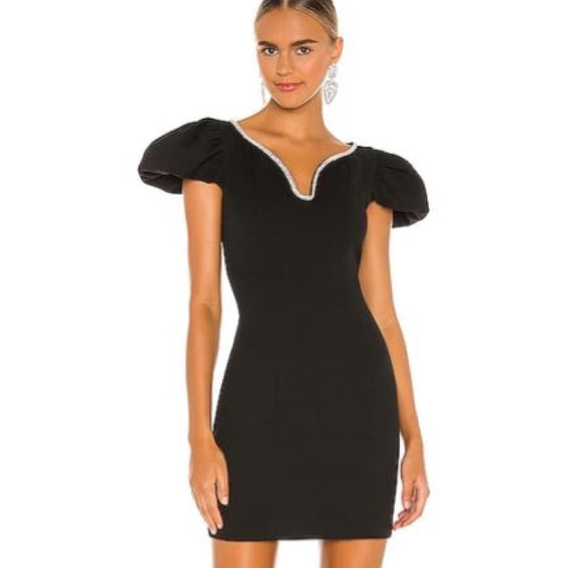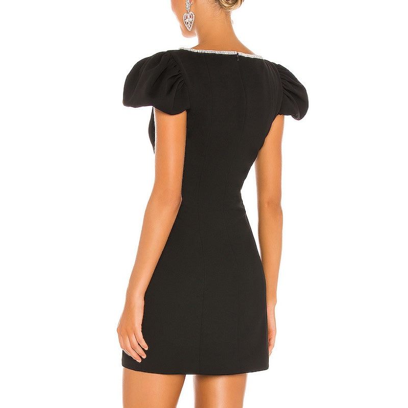 Fully lined. Hidden back zipper closure. Crystal embellished neckline. Boned front. Puff sleeves.