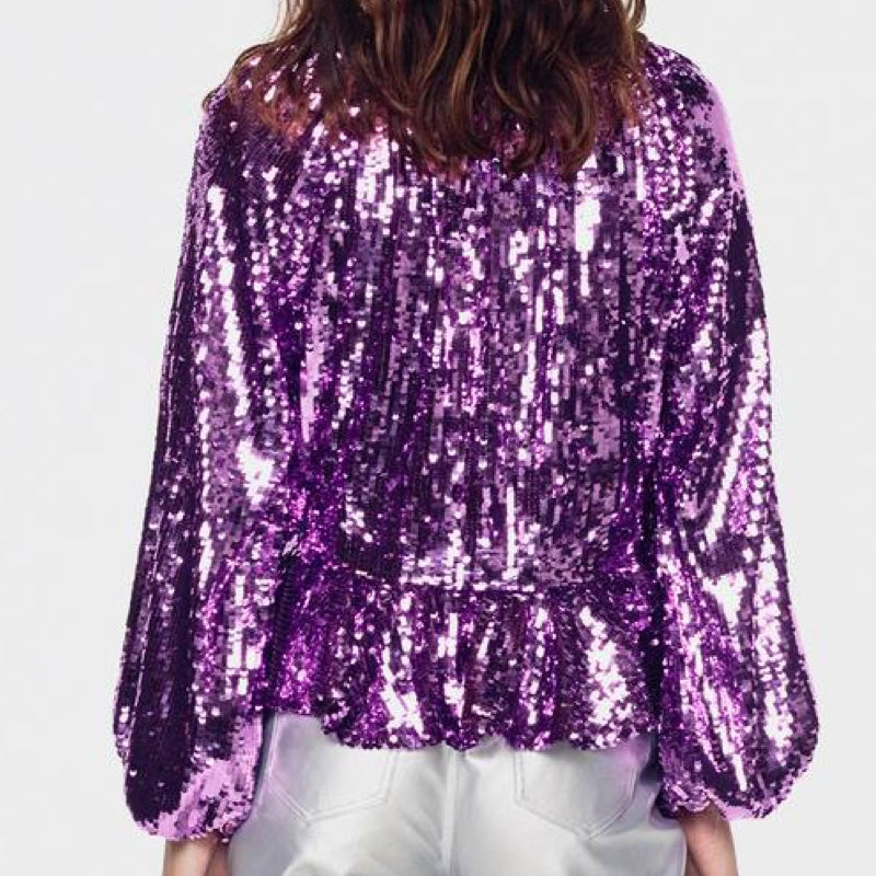 Disco-inspired ruffled peplum top featuring a functional tie and puff sleeves.