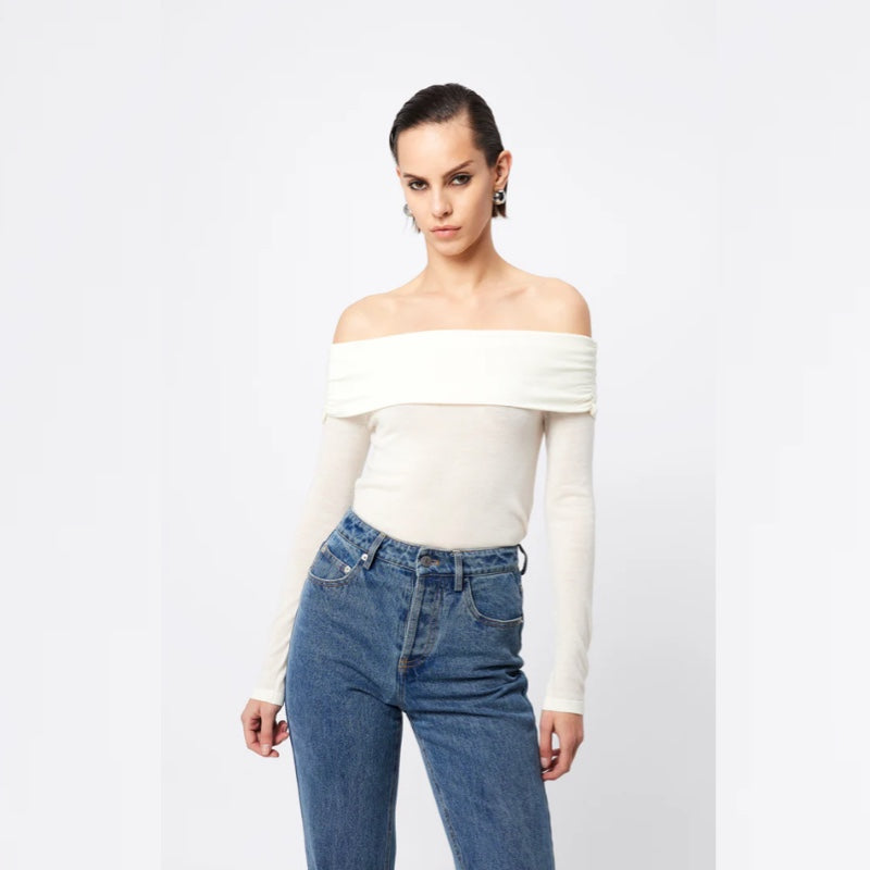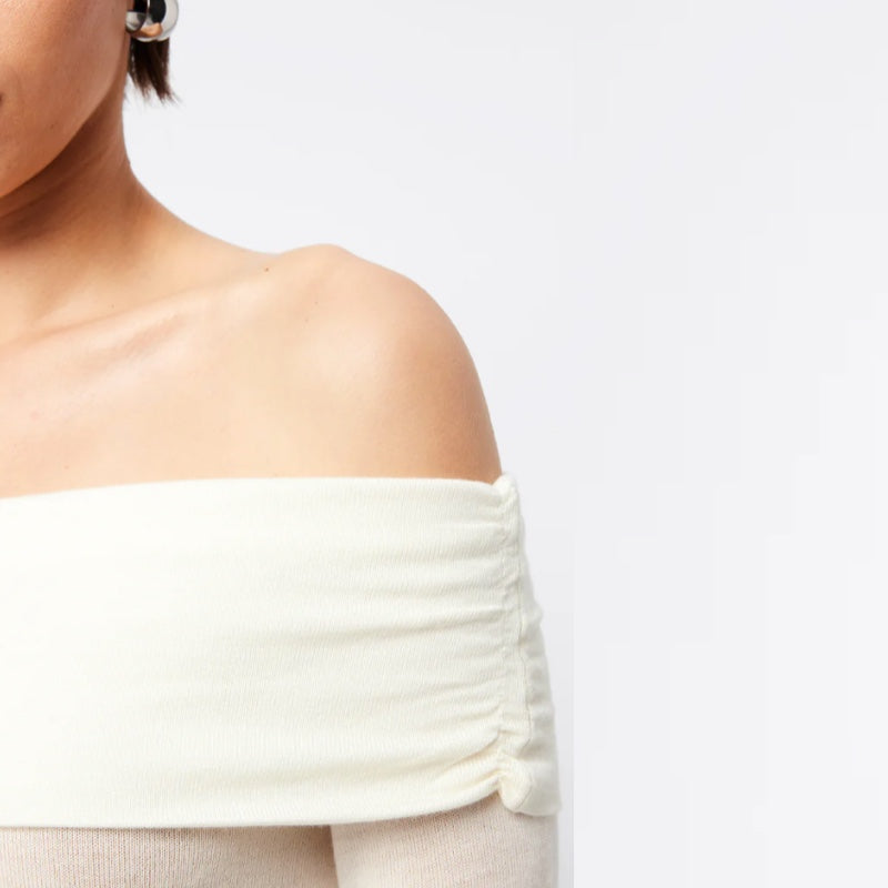 The Maine Off-Shoulder Top in Off-White is crafted from 100% pure merino wool, striking the perfect balance between warmth and elegance. Designed for a sleek, form-fitting silhouette, it features a bardot neckline, double-layered fold-over bust detail, and long sleeves. A versatile knitwear staple, it can be layered or worn on its own, effortlessly pairing with denim for a refined day-to-night look.