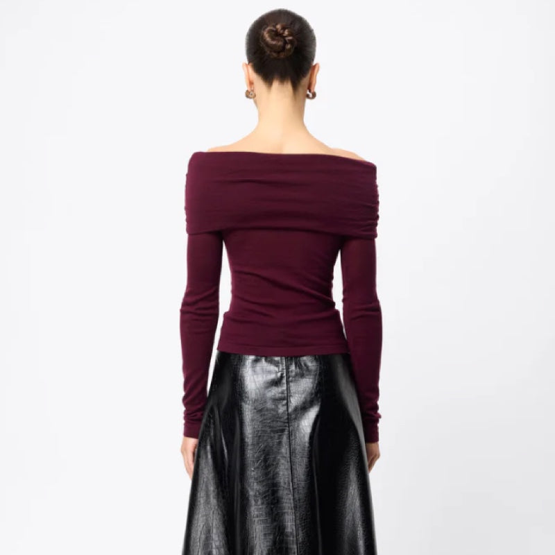 The Maine Off-Shoulder Top in Cherry Lacquer is crafted from 100% pure Merino wool, striking the perfect balance between warmth and elegance. Designed as a sleek, form-fitting piece, it features a bardot neckline with double-layered fold-over bust detail and long sleeves. A versatile knitwear staple, it can be layered under a coat or worn on its own, effortlessly pairing with denim or tailoring for a refined day-to-night look.