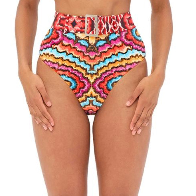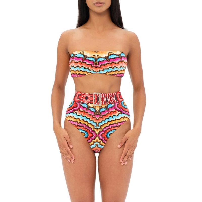 A bold colorful butterfly inspired print bandeau style high rise belted bikin