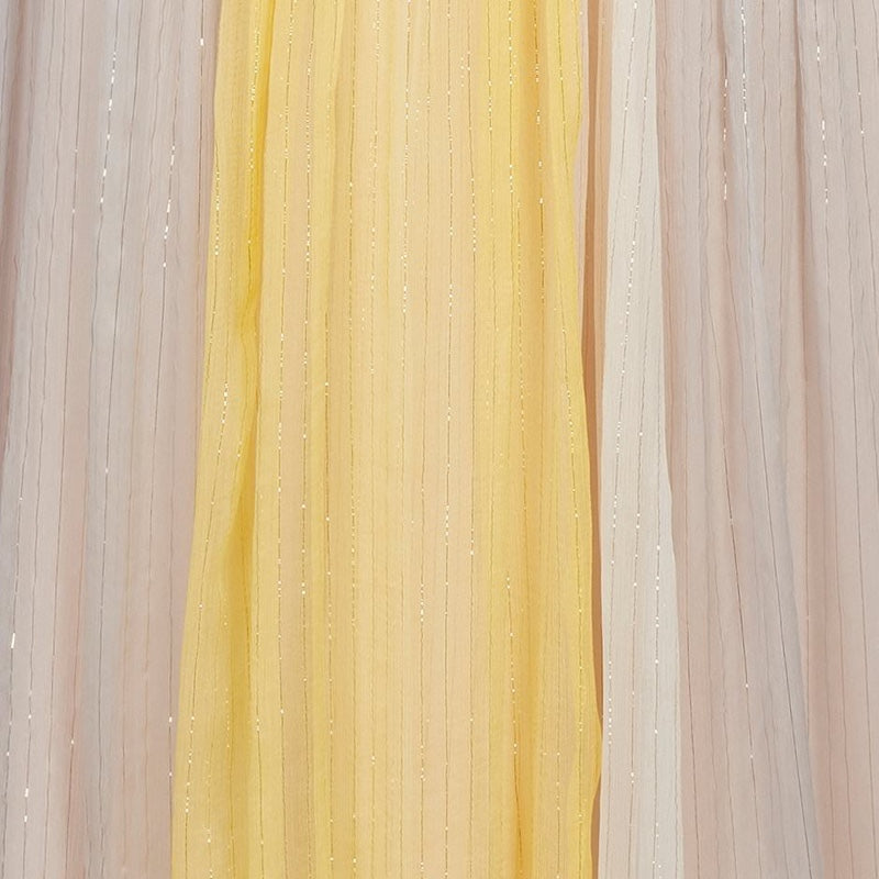 The style is fully lined with an invisible centre back zip. The dress features tonal color splicing and lurex gold detailing throughout the fabric.