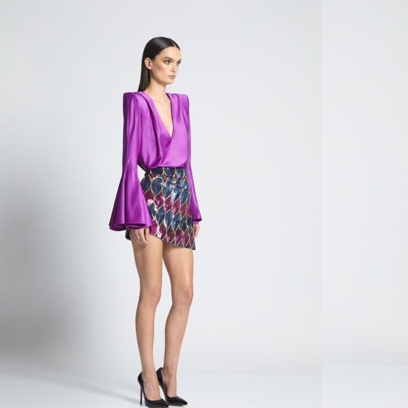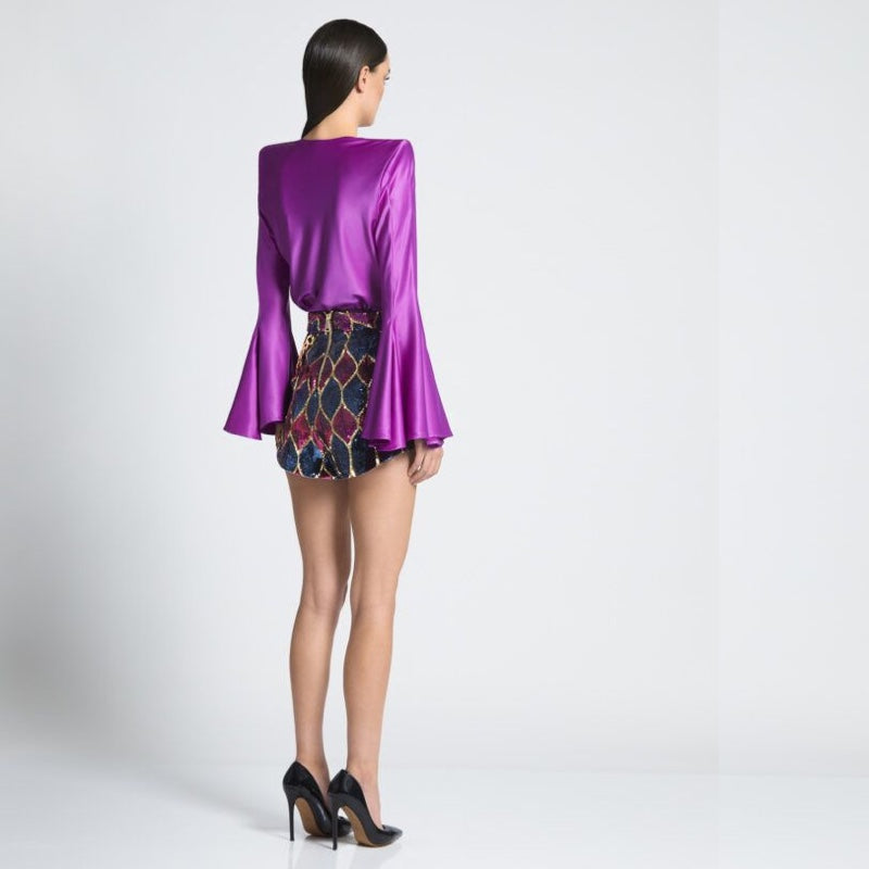Fully lined teardrop sequin skort with chain detailing & front clasp closure.