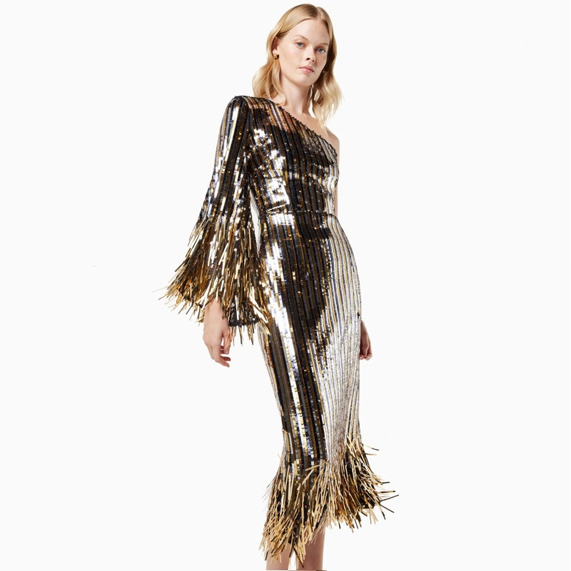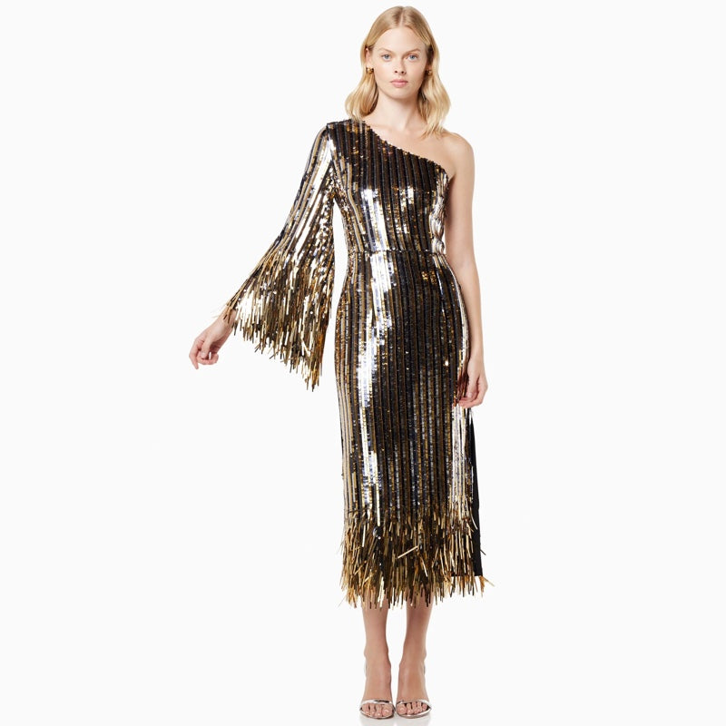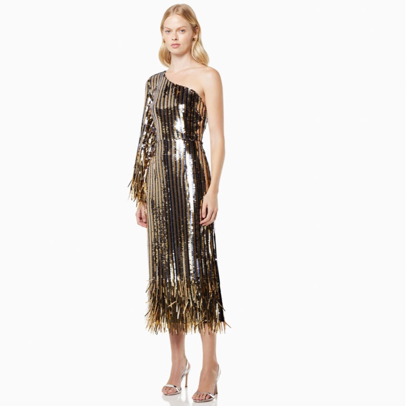 Let the statement Elliatt Collective Mezzanine Gown in Black and Gold Sequins be your dress of choice at your next formal or gala event! With a one shoulder neckline and statement fringed sleeve, this dress features vertical sequins in shades of black and gold to create an elegant, and long line. With a fitted waist seam and straight cut skirt, this dress is designed to skim over your body. The hemline of the skirt is finished with fringing and is perfect for dancing the night away!