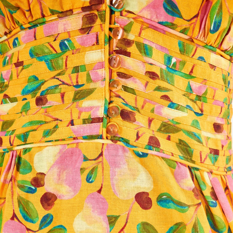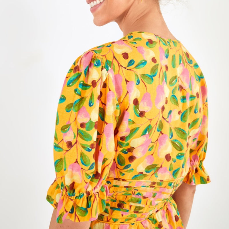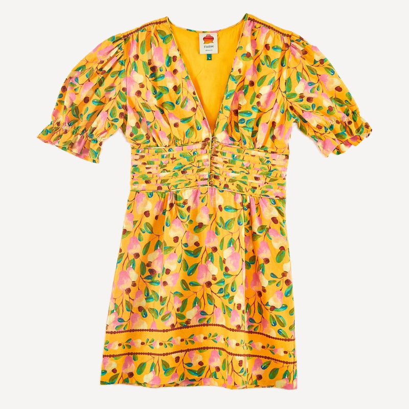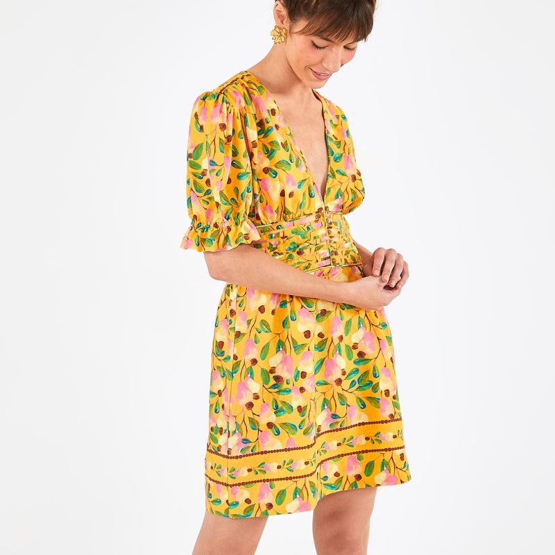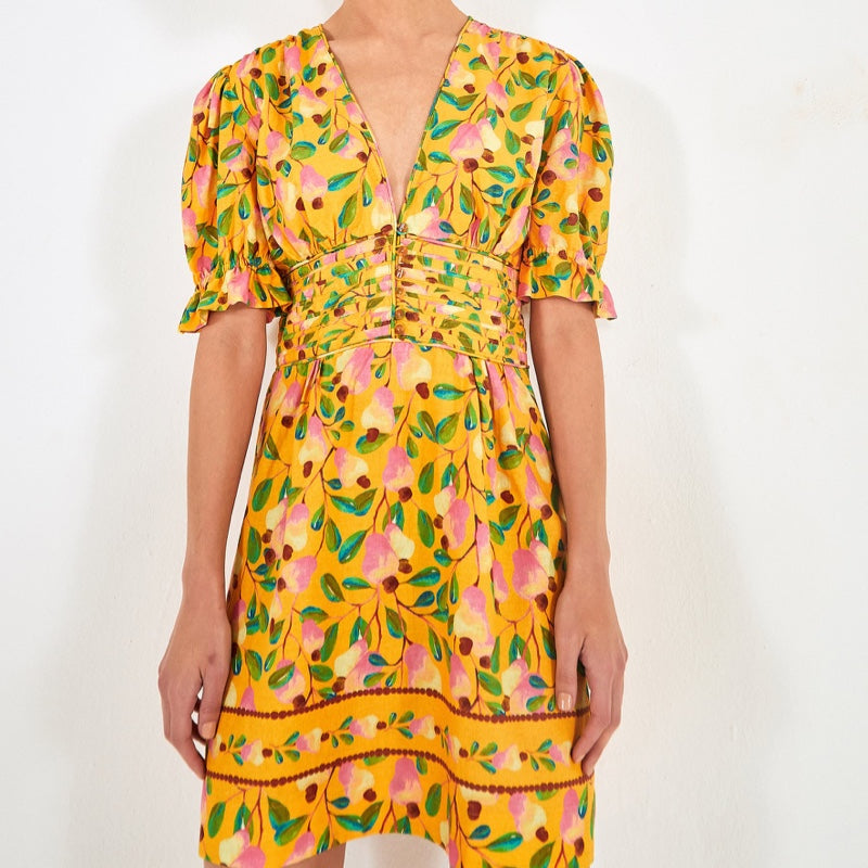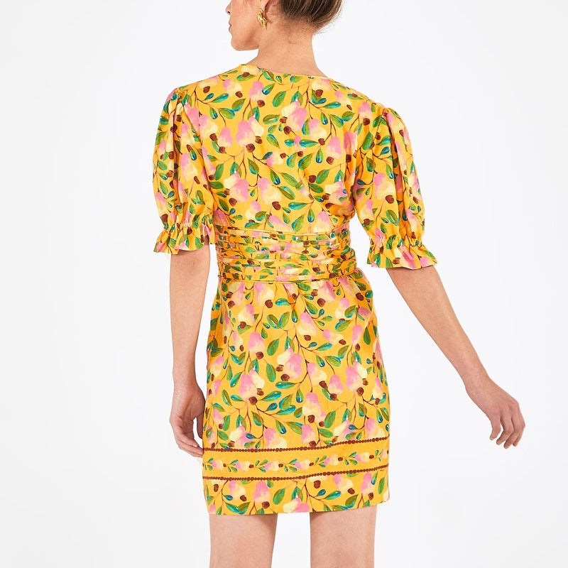 Short sleeve mini dress with V neckline. Fitted bodice with beaded button closure and piped detailing. Puffed sleeve with ruffle.