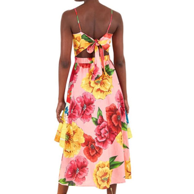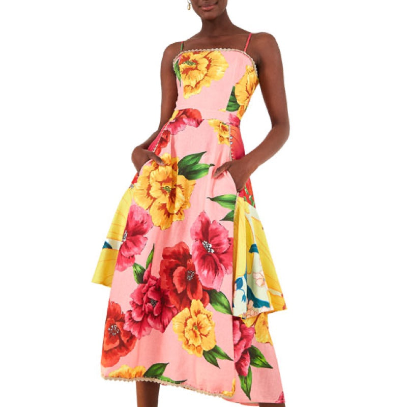 Square neckline. Thin Shoulder Strap with cascading side detail. A-line silhouette. Hem falls below the knee. Composed of linen and Viscose.