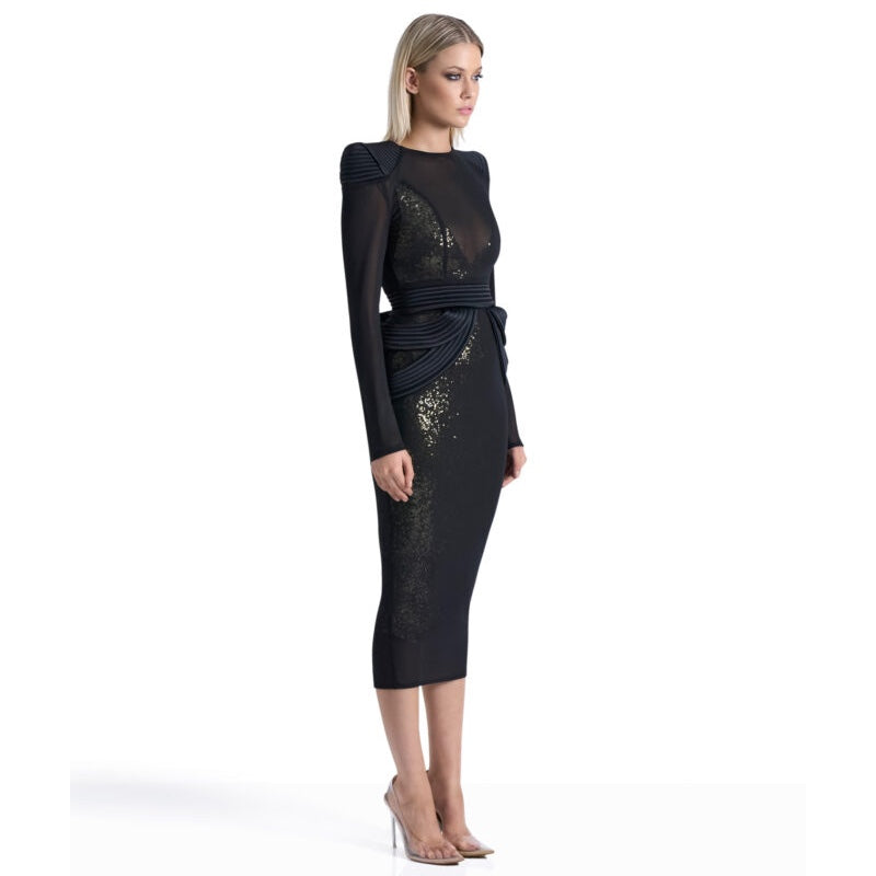 A SHEER STRETCH MESH MIDI DRESS WITH STITCH SATIN HIP DETAILING AND SHOULDER CAPS. COMES WITH STRETCH SEQUIN SLIP