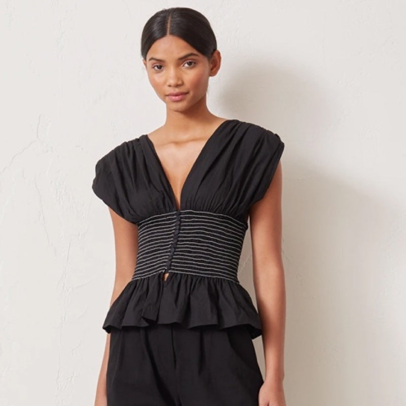 Shirred cotton peplum top which features a shirred waist detail and v neckline and back. Gathering detail on shoulder, bust and peplum finish this stunning piece off perfectly.