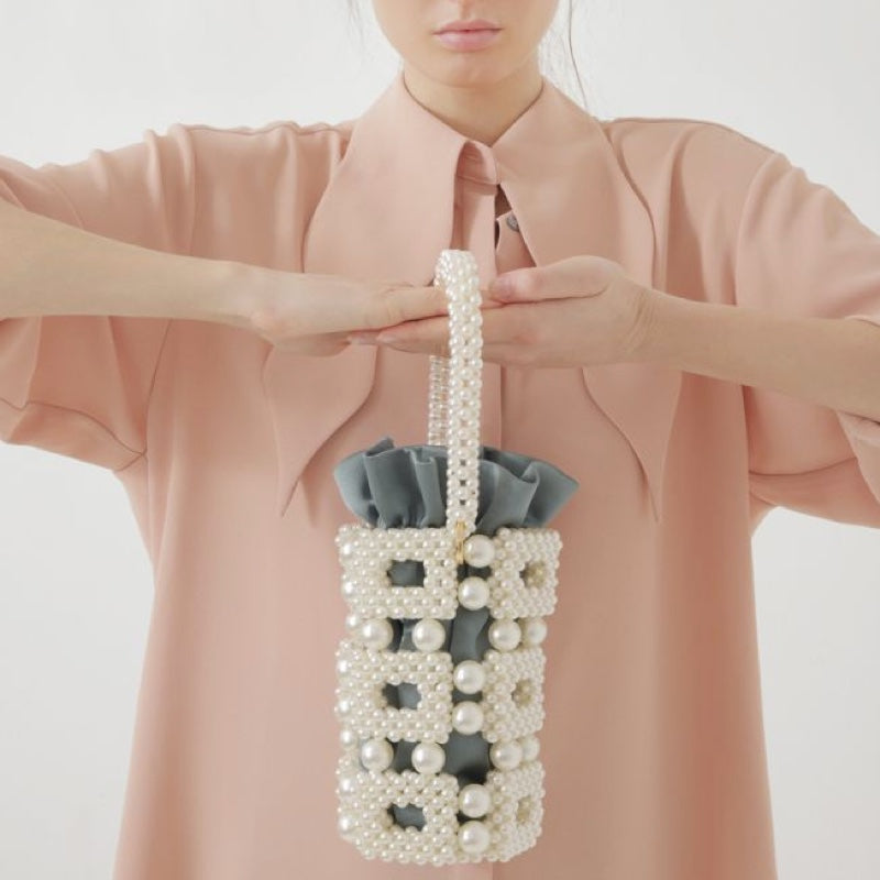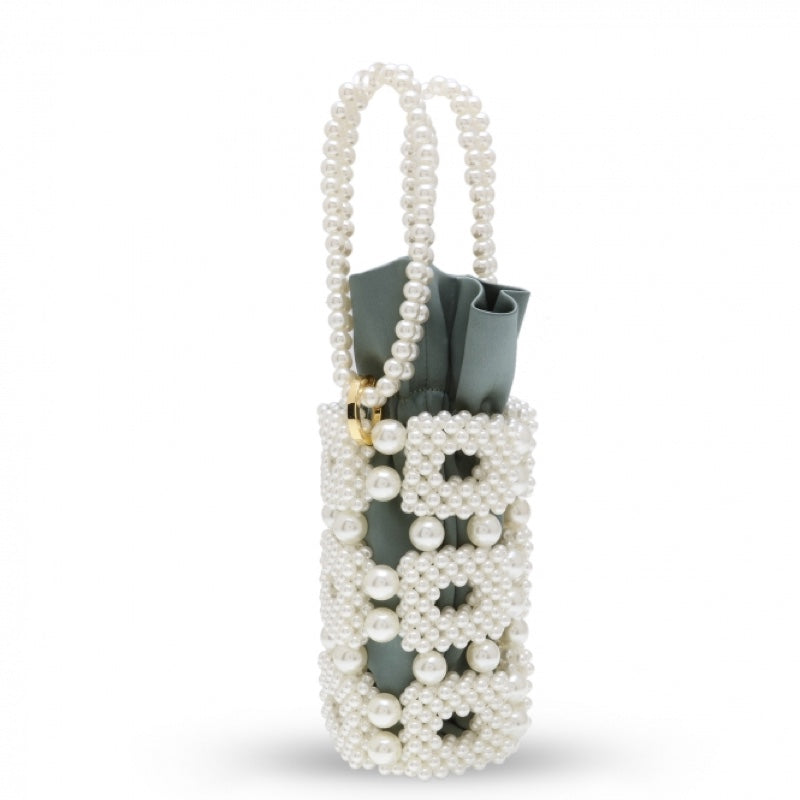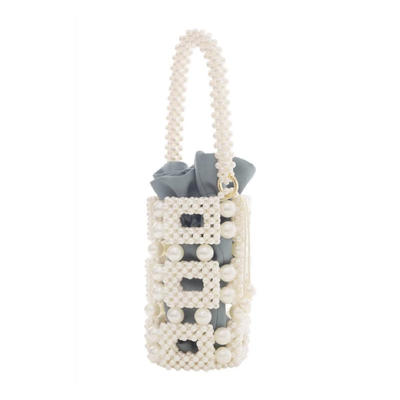 Pear Embellished bucket bag with removable ocean blue silk-satin pouch. Beaded bottom and handles with gold engrave logo hardware. 60% Viscose. 40% Polyester. 100% Pearl Bead. Handmade in Tbilisi.