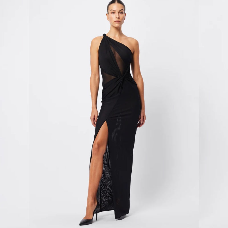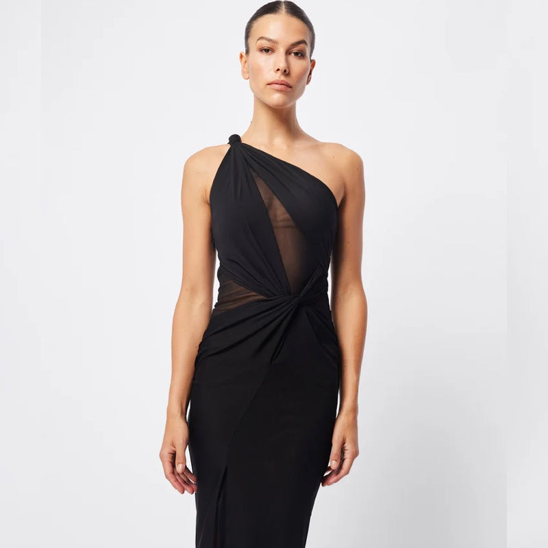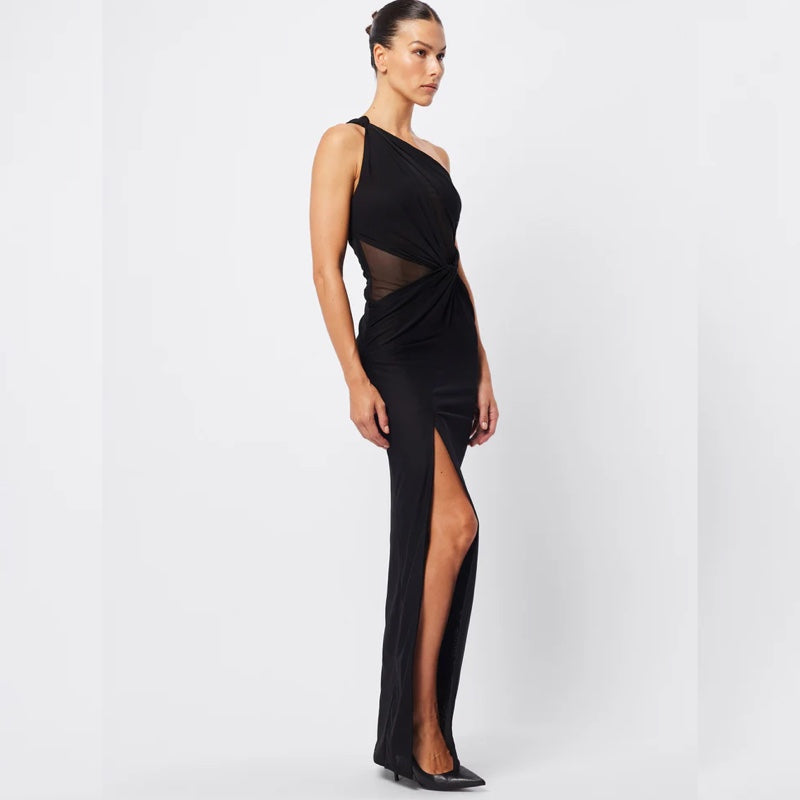 The Rebound Maxi Dress in black is a statement piece. It features a double-layer mesh fabrication, one-shoulder design with knot detailing, side front split, and twist detail at the waist for a sleek, body-skimming fit. Pair with elegant heels and a clutch to achieve a polished and sophisticated look for any event.