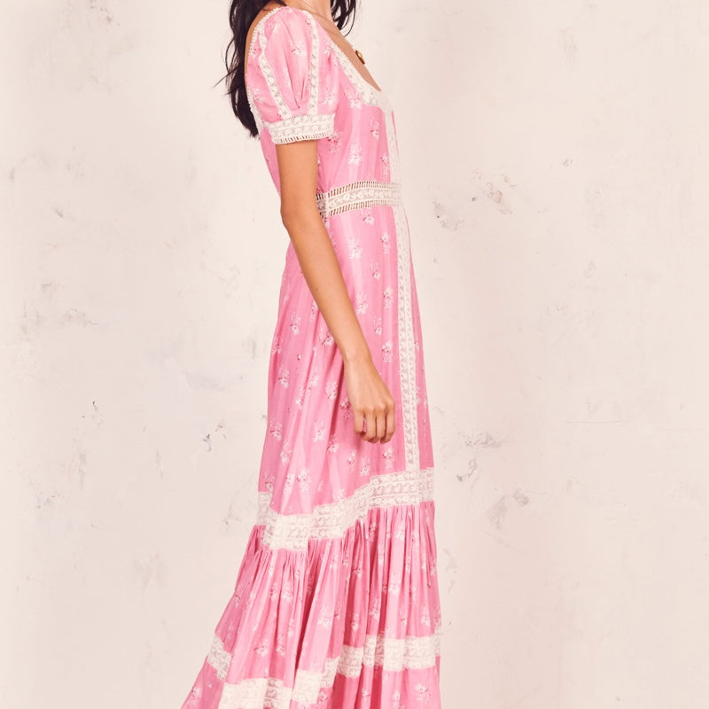 The coveted Ryan Dress is reimagined in hand-dyed custom dobby cotton with contrast floral lace and a calico flower print. This full sweep frock has a deep scoop neck, subdued puffed sleeves and a fitted bodice. Below a fixed lace waistband, the skirt is narrow until halfway down, when it flows into an elongated shirred panel to the ankle.