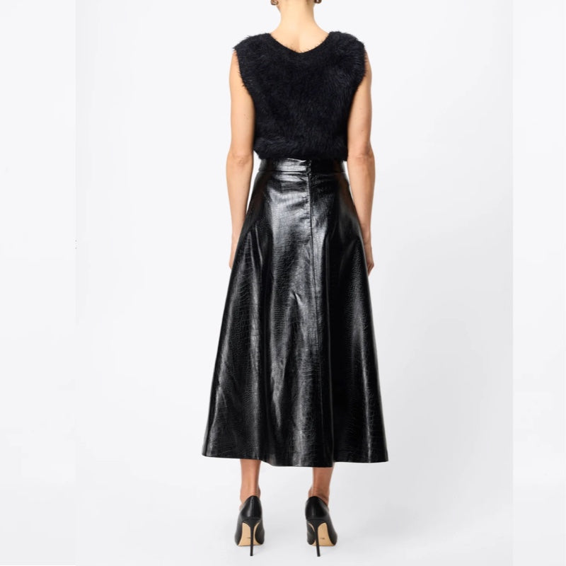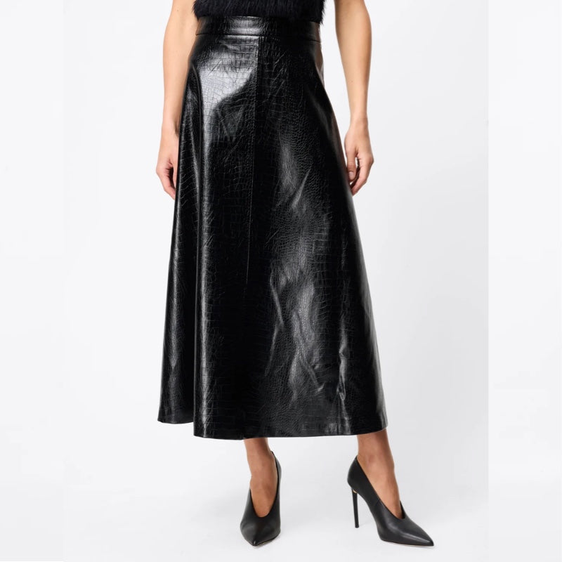 he Saltwater Maxi Skirt brings bold structure and sophistication to any look. Crafted from luxe faux croc leather, this high-waisted A-line silhouette effortlessly transitions from day to night and features a sleek fixed waistband with invisible centre-back zip closure. Style it with a fitted knit or tailored shirt for a modern take on classic dressing.