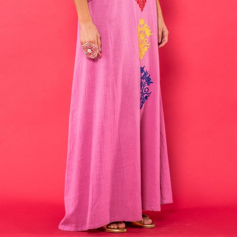 Embroidered maxi length style kaftan featuring mock neck with keyhole closure, three quarter sleeves, adjustable self-tie at back, and straight hem. Lined.