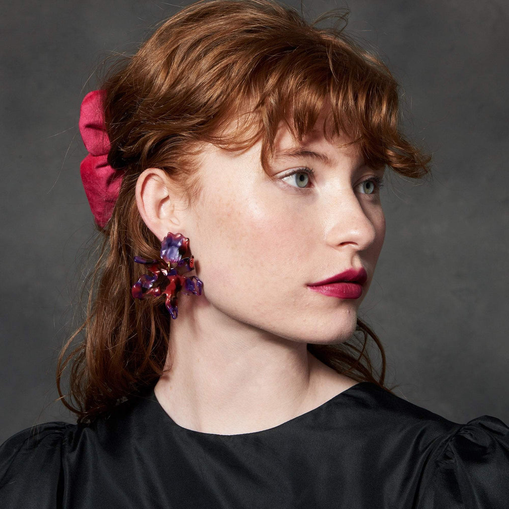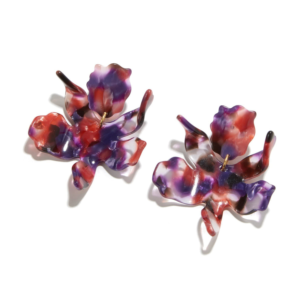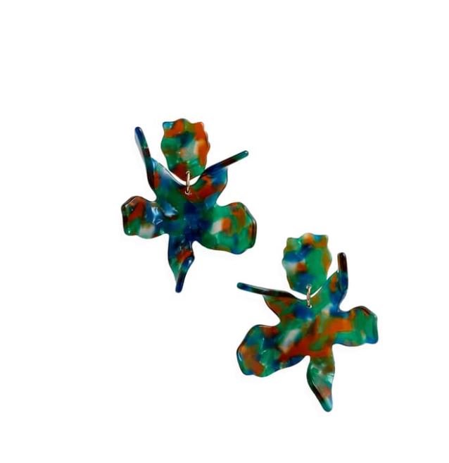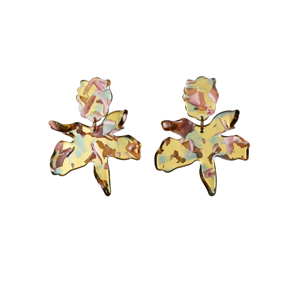 Our best selling earring now in a smaller scale. 2 1/4" by 1 3/4" hand swirled amber confetti acetate lily flower with a surgical steel post closure. Lightweight and wearable from day to night.